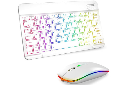 Ultra thin Bluetooth Keyboard and Mouse Combo for iPad Rechargeable RGB Wireless Keyboard Mouse 7-Color Backlit-White