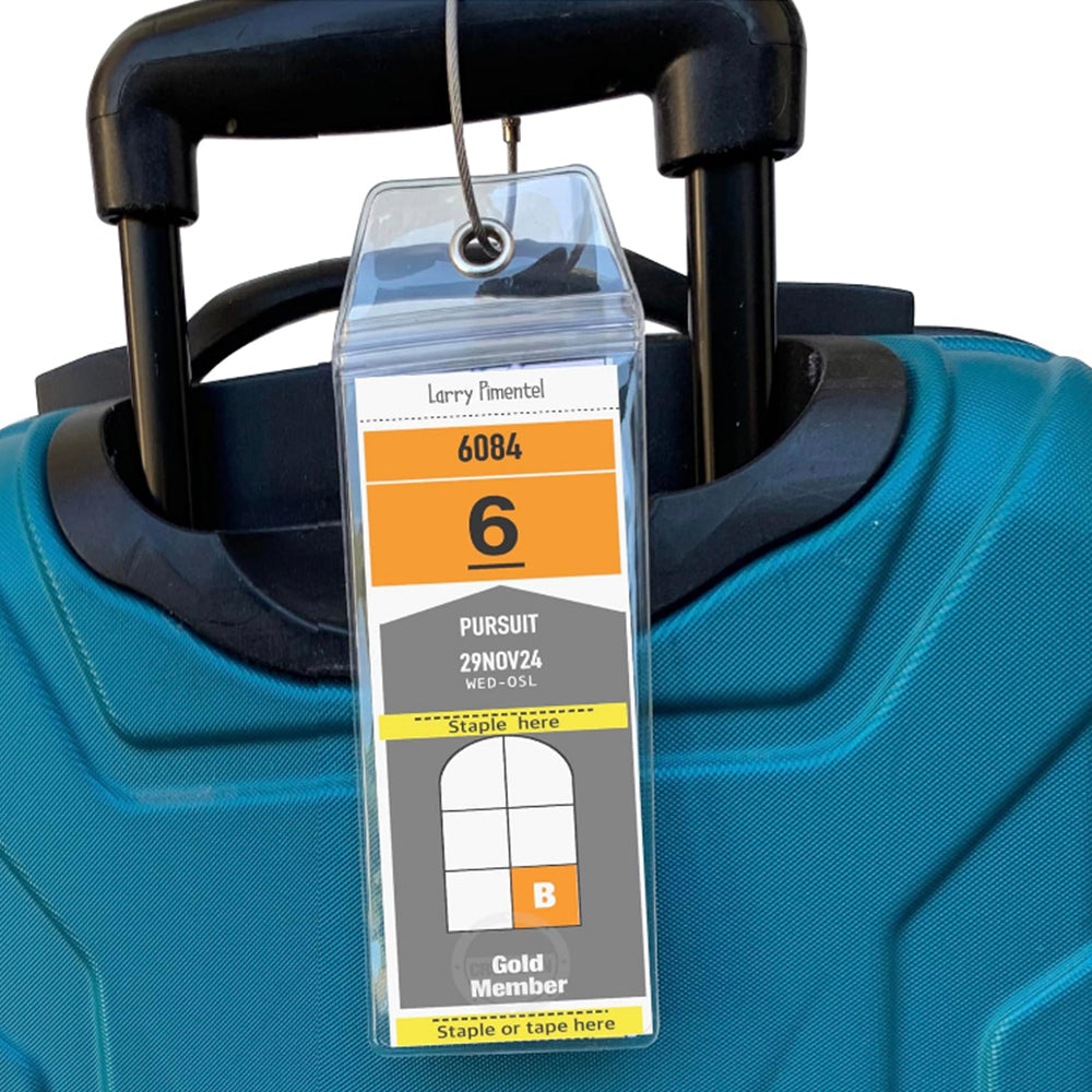 - Clear plastic makes cruise luggage tag easy to read, farewell to paper tag covered in tape.