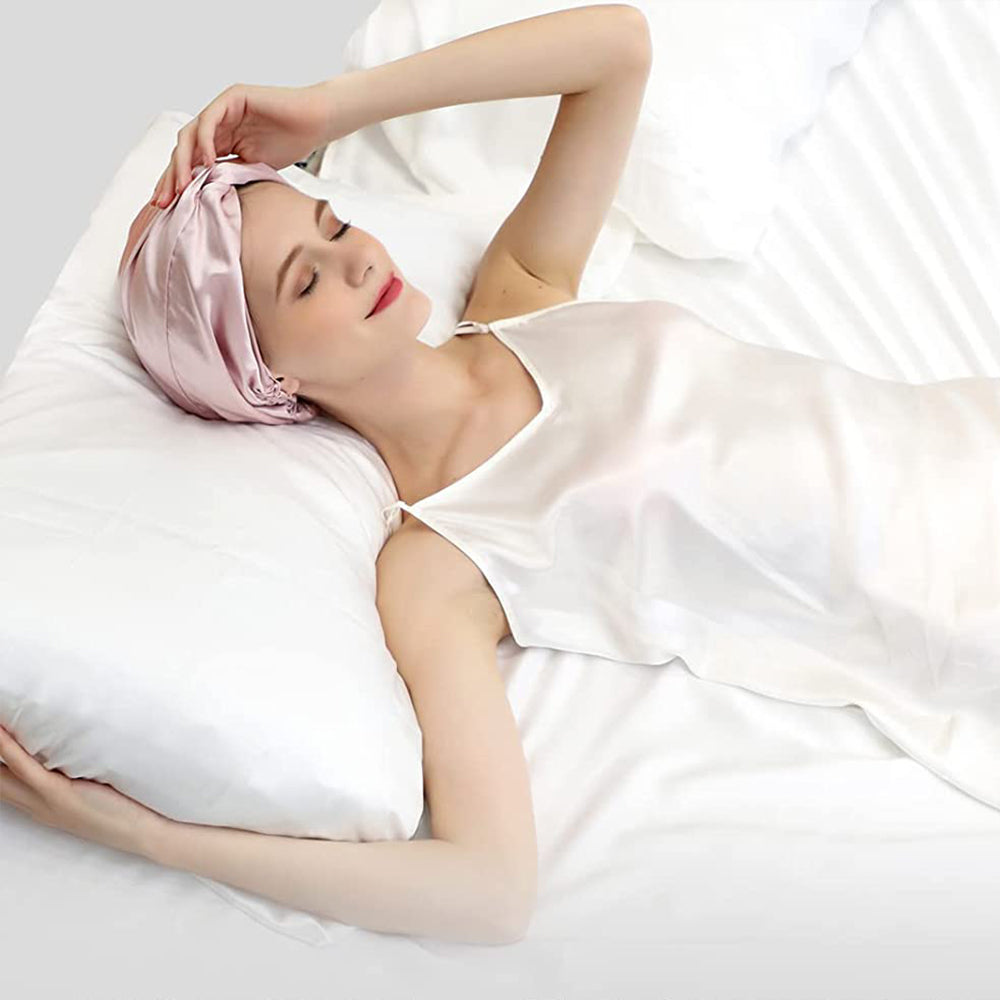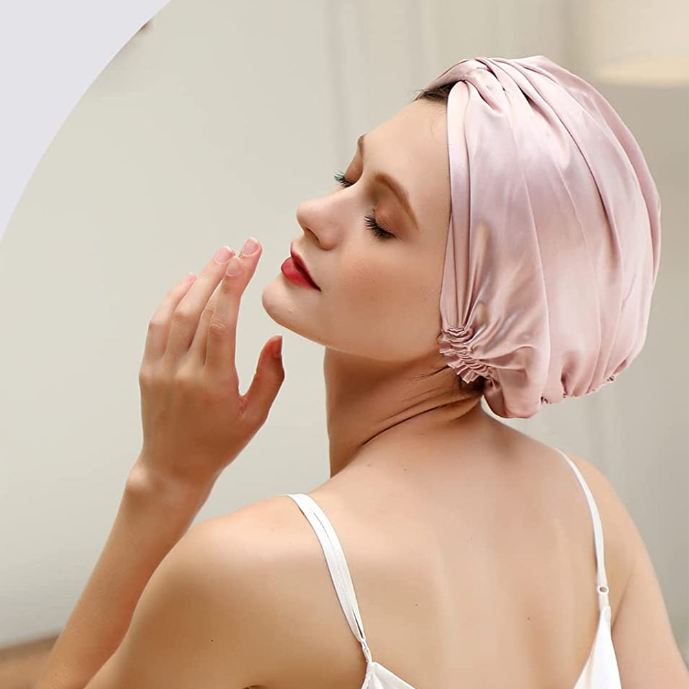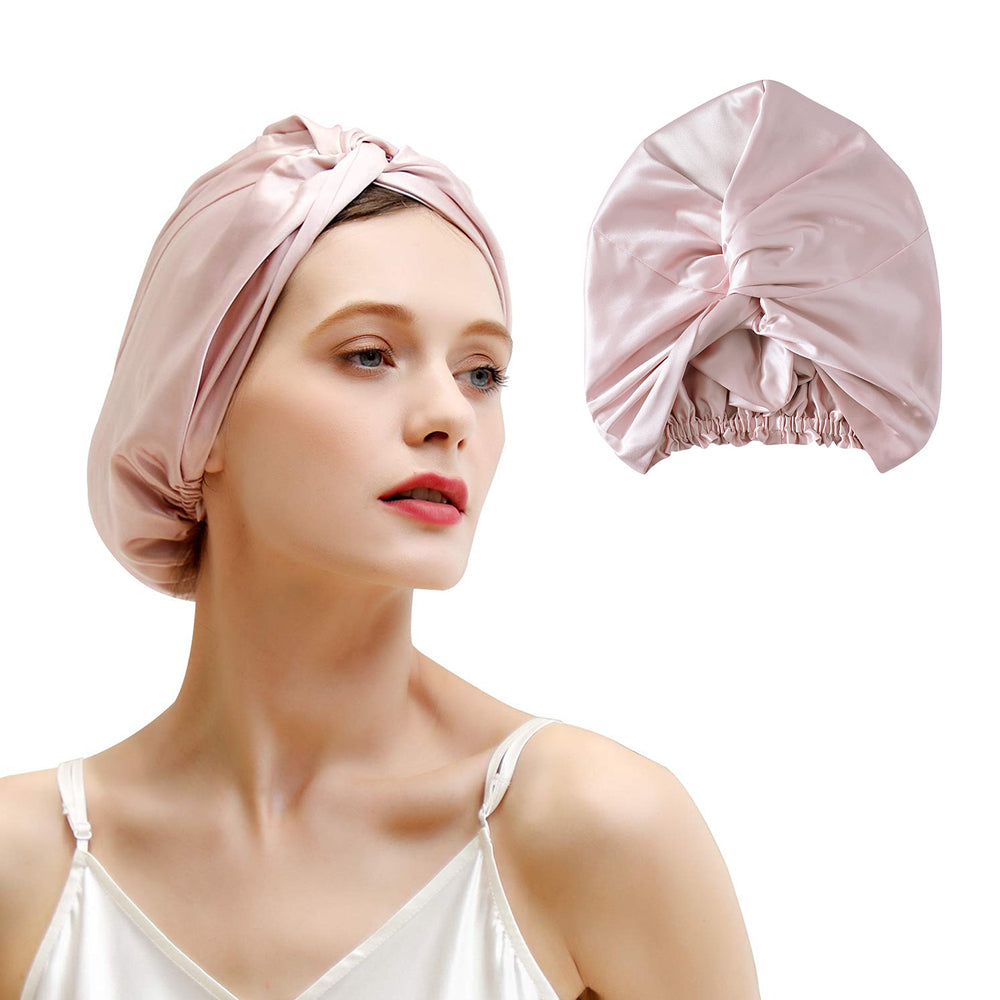 100% Silk Bonnet Sleep Cap for Women Hair Care Adjustable Knotted Turban Hat Pink