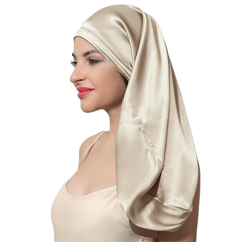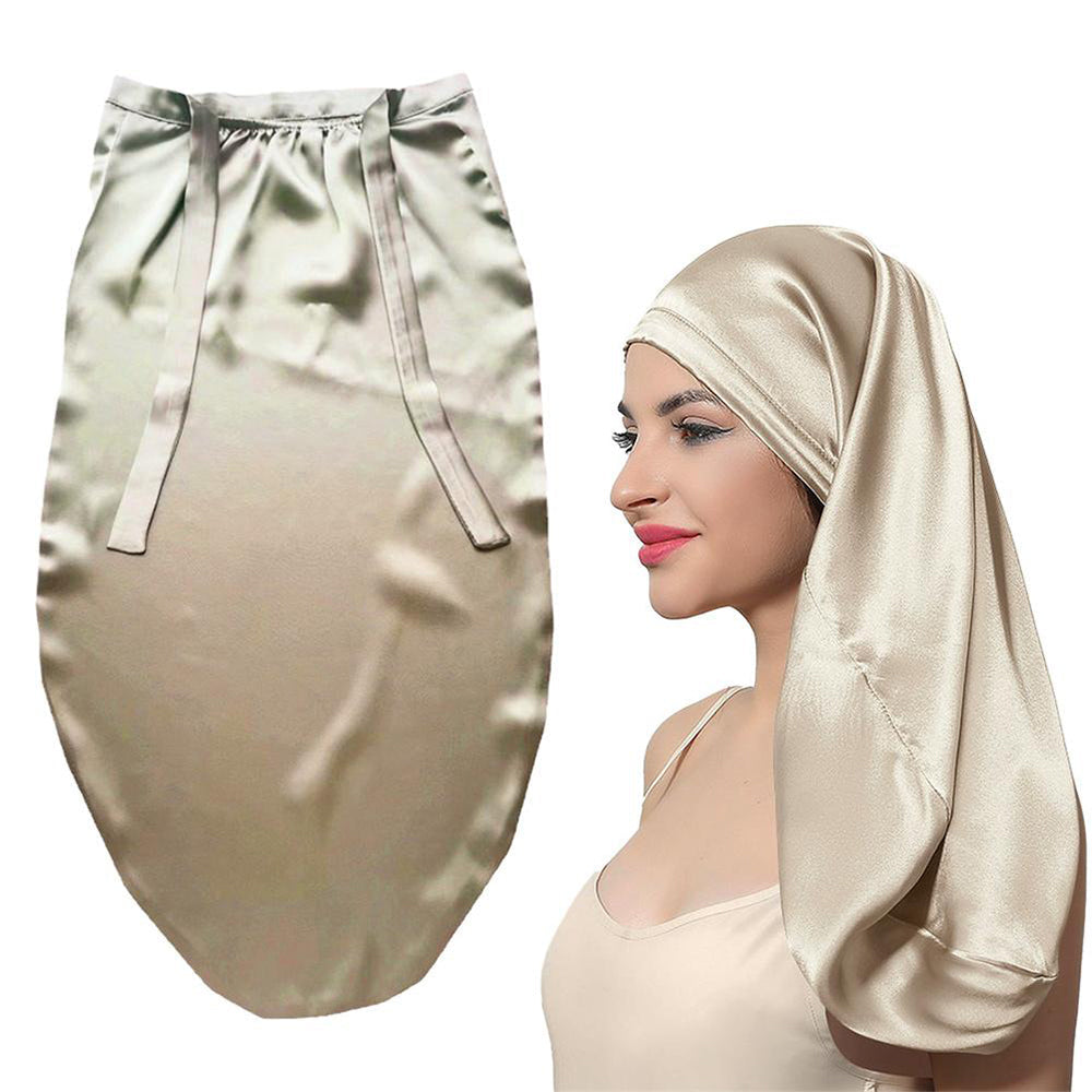 100%Silk Long Bonnet Sleep Cap Long Satin Night Cap Khaki