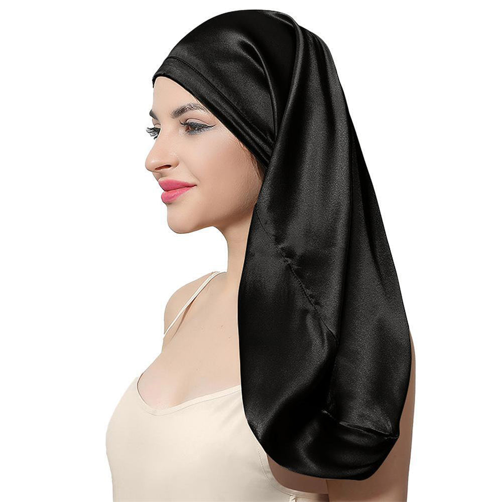 100%Silk Long Bonnet Sleep Cap Long Satin Night Cap Black