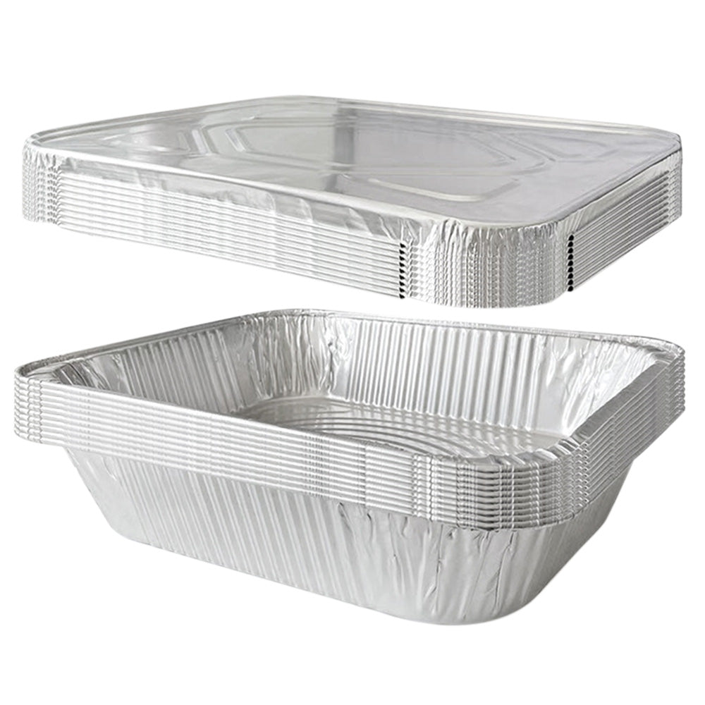 Durable aluminum foil pans with lids, perfect for baking, roasting, and food storage. Ideal for use in ovens, air fryers, and microwaves with metal interiors.