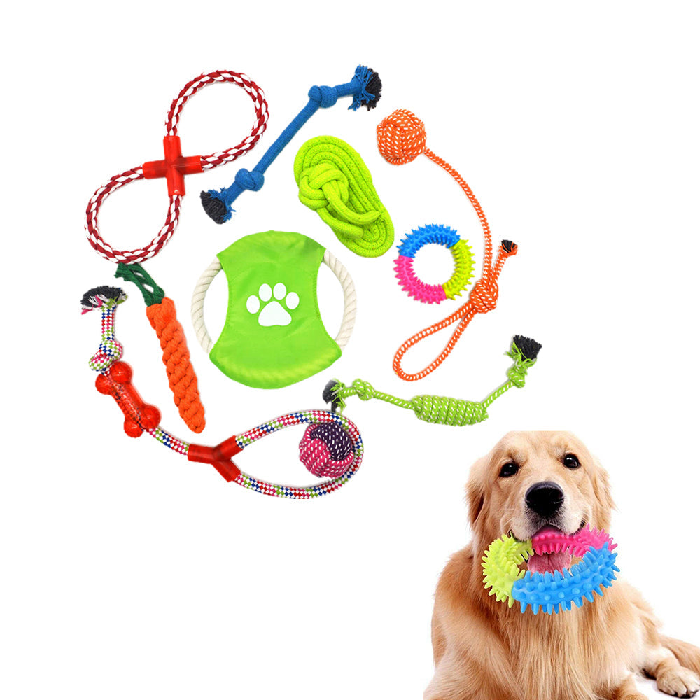 - Set includes 10 kinds of pet bite toys, in different colour and different shape, such as long lob, rope ball, frisbee, rope knot and candy rope knot.