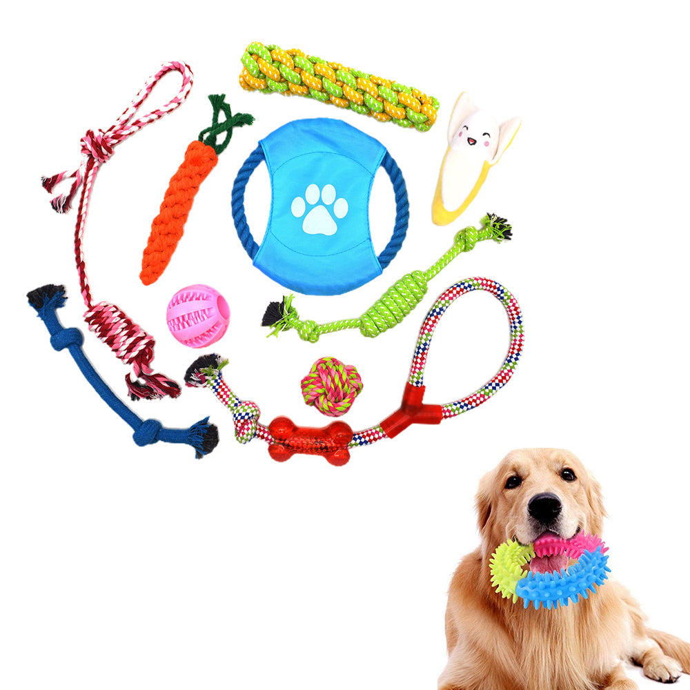 - Set includes 10 kinds of pet bite toys, in different colour and different shape, such as long lob, rope ball, frisbee, rope knot and candy rope knot.