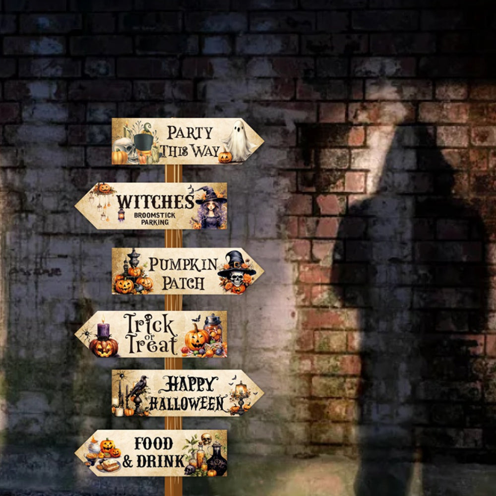 - Totally 12 pieces Halloween arrow signs, including 2 Party This Way, 2 Witches, 2 Pumpkin Patch, 2 Trick Or Treat, 2 Happy Halloween and 2 Food And Drink.