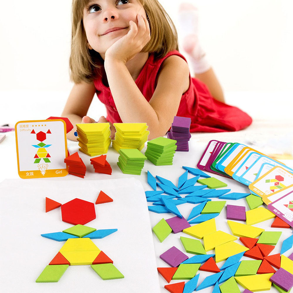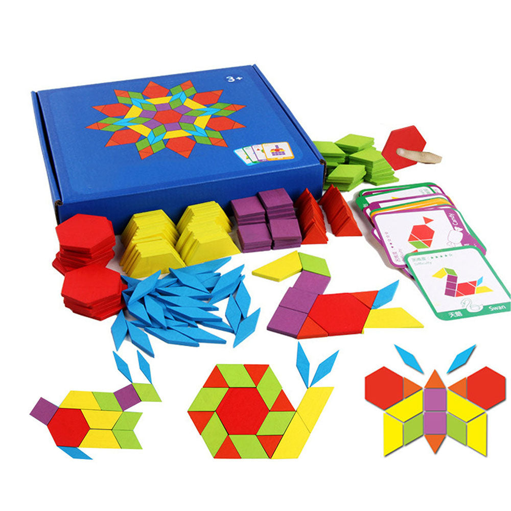 The wooden pattern blocks help children to recognize different geometric shapes and develop logical thinking and spatial cognitive skills.
