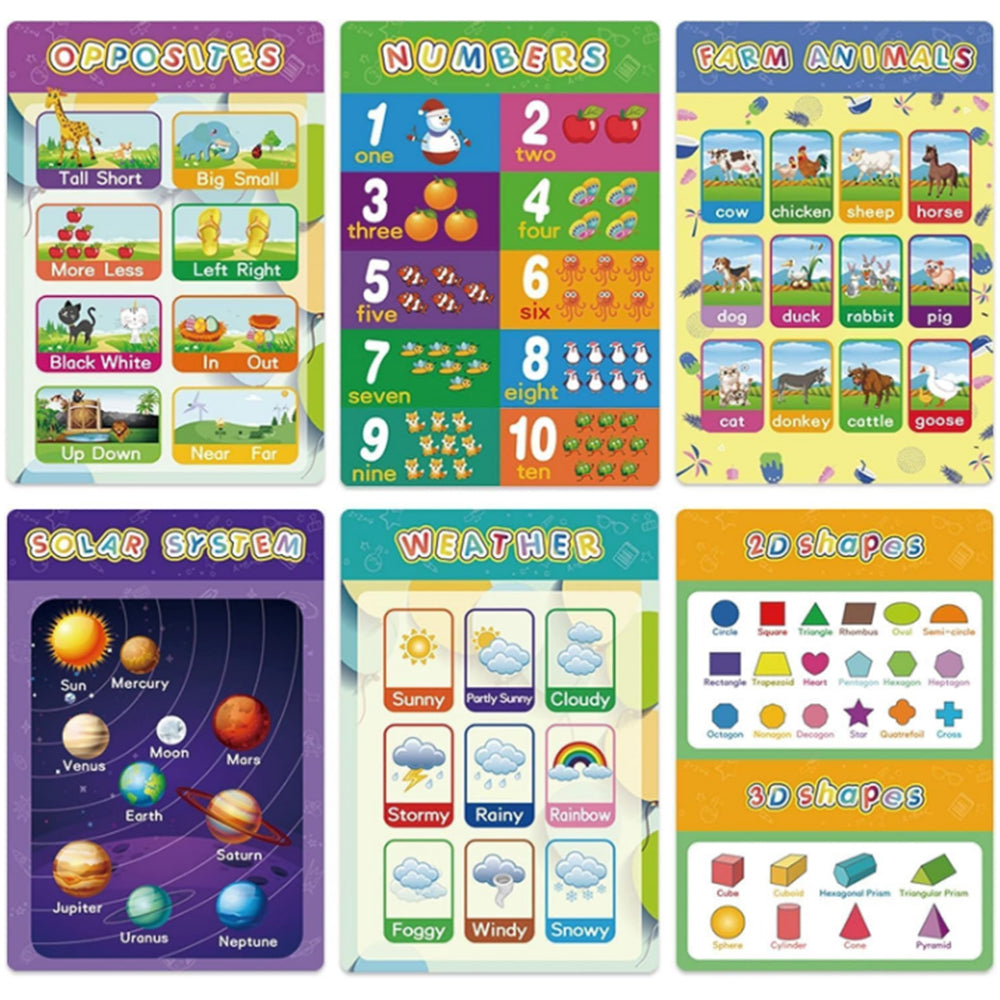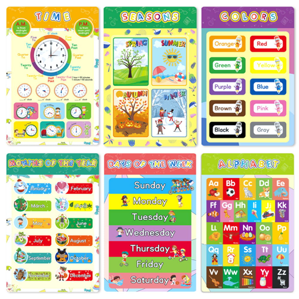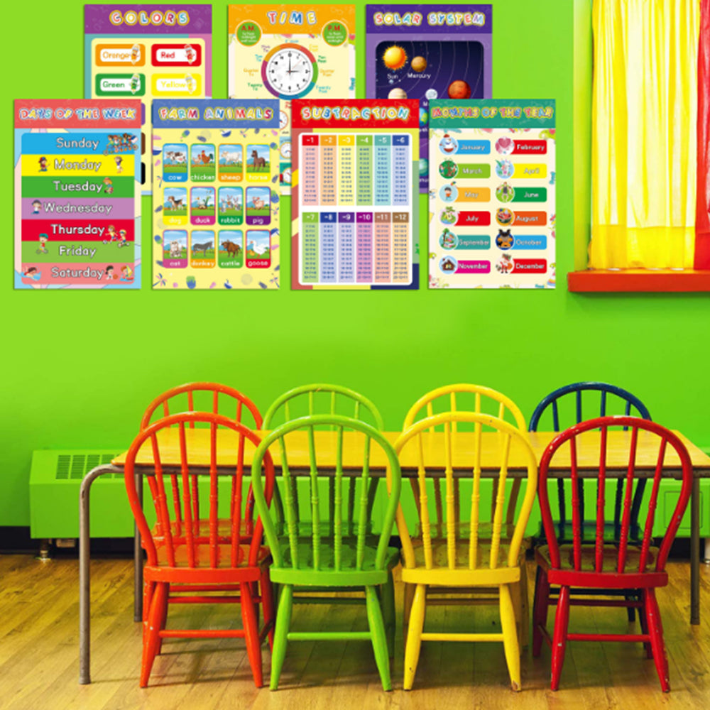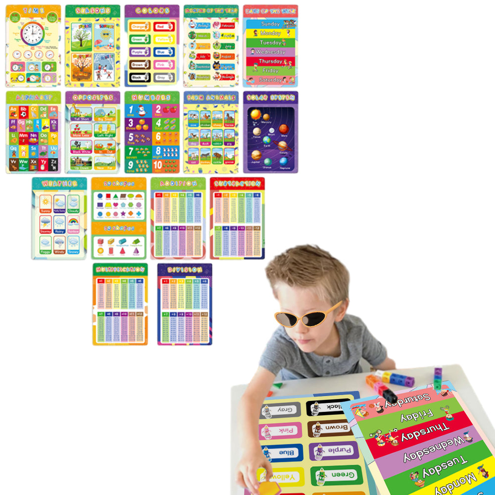 - Comes with 16 educational posters featuring a variety of topics, including time, seasons, colors, fruits, alphabet, days of the week, comparisons, numbers, farm animals, the solar system, weather, shapes, addition, subtraction, multiplication, and division.