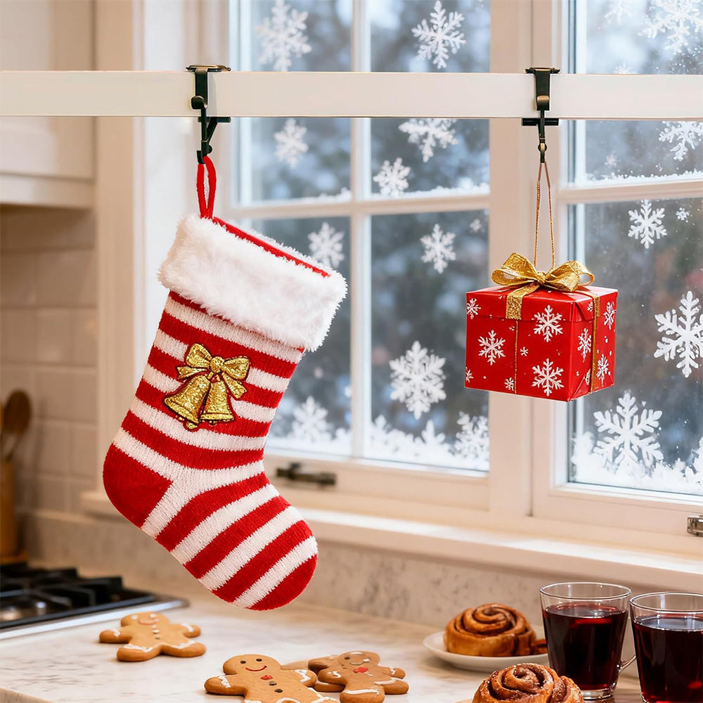 Dual-purpose metal stocking hanger set with adjustable design and non-slip silicone pads, perfect for hanging stockings and garlands on mantels, doors, or stair railings.