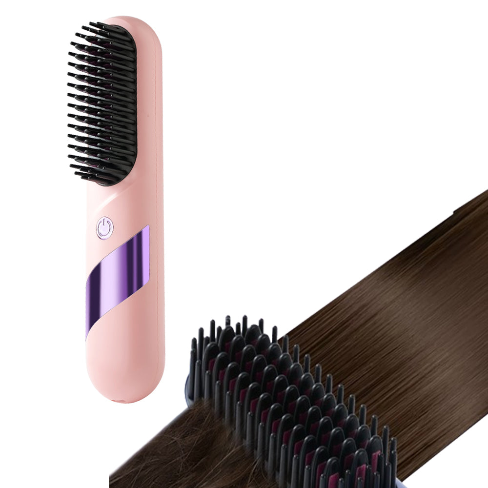 2-in-1 Cordless Hair Straightener Brush Portable Hair Comb with LED Display Hair Styling Tool Pink