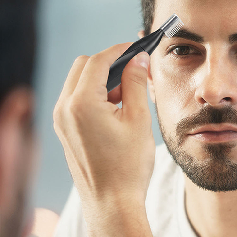 An electric nose hair trimmer for men designed with a stainless steel head and precision handle, featuring built-in guide combs for easy grooming and detachable head for easy cleaning.