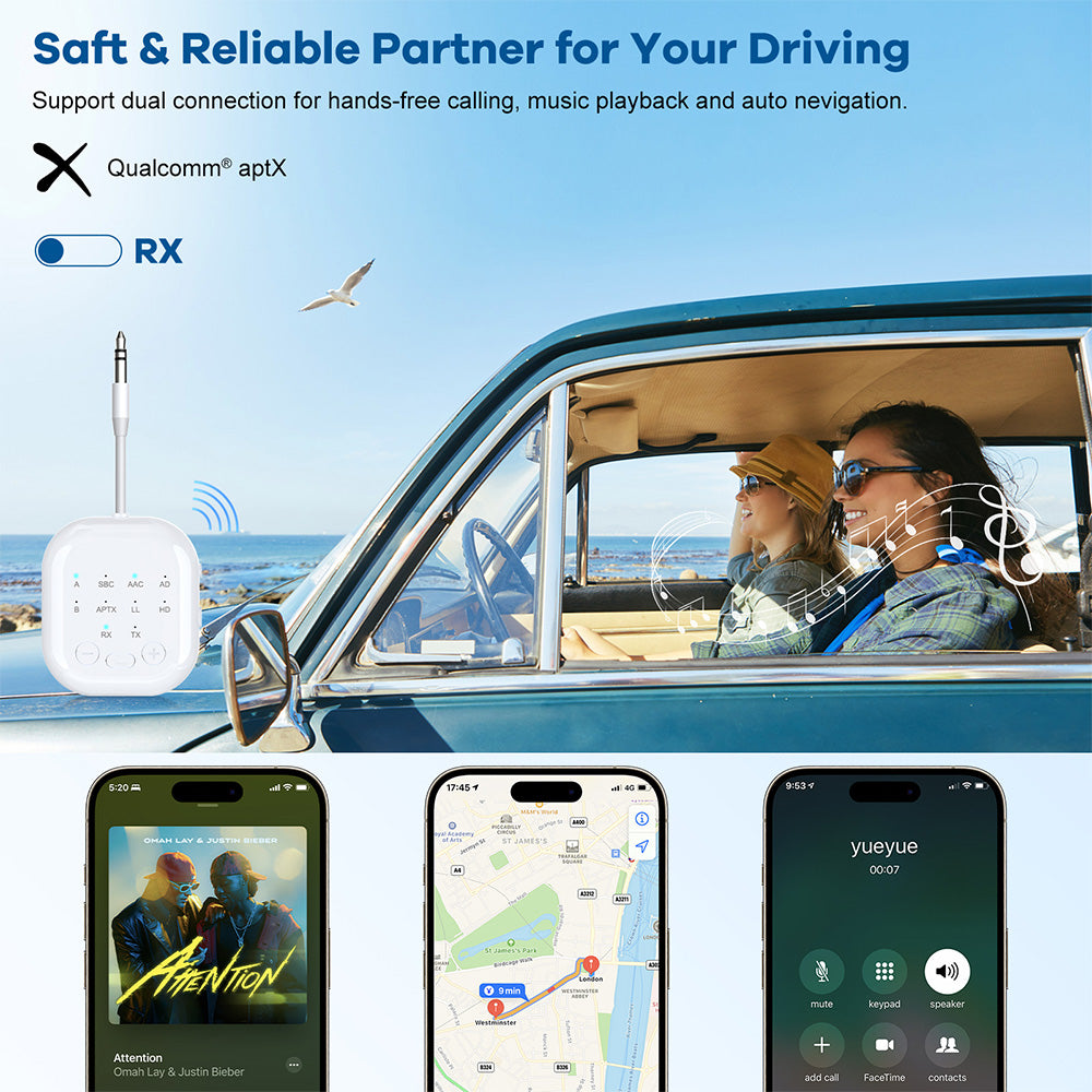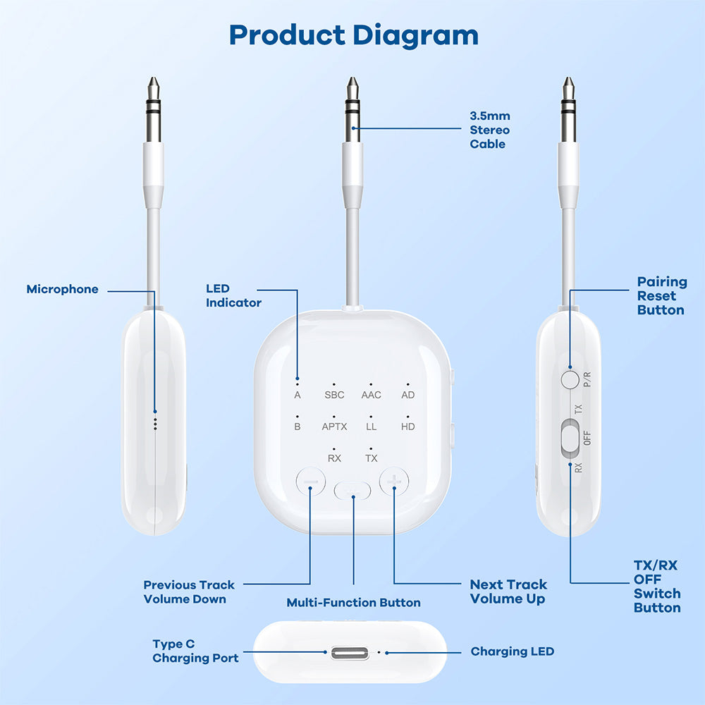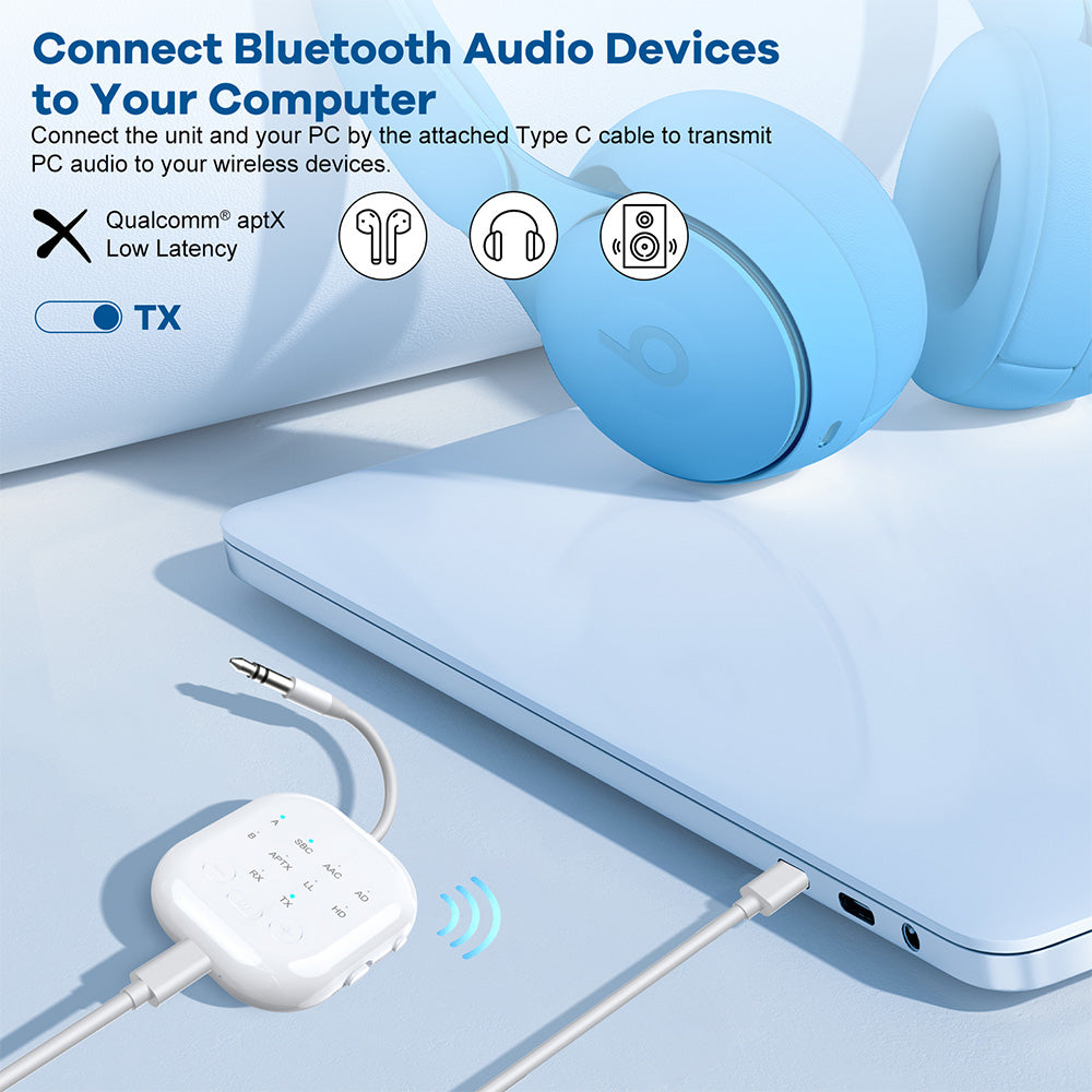 2-in-1Wireless Adapter Transmitter Receiver with Audio Sharing for Up to 2 Wireless Headphones