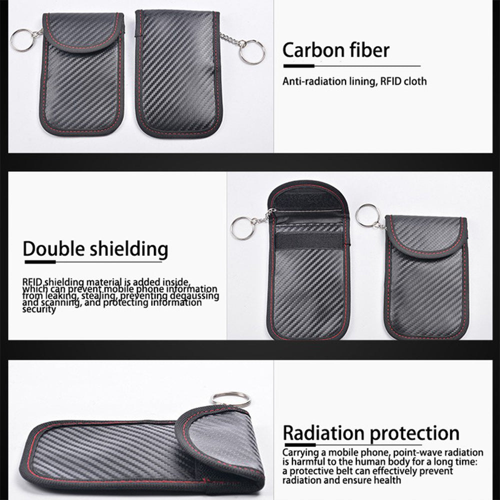 - The smaller/front pocket is anti-radiation, best for storing ID card, bank cards, etc. The larger/back pocket is for signal shielding, best for storing car key fobs.