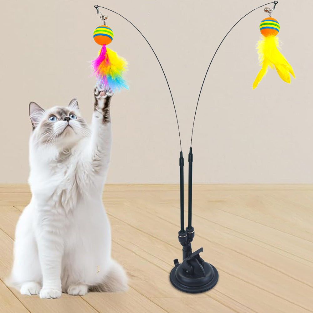 - Hands-Free Fun: The suction cup sticks securely to smooth surfaces like tiles, windows, and glass, allowing your cat to play while you relax or attend to other tasks. The suction cup base also has two holes where steel wire rods can be inserted, adding more interactive fun and variety to the play experience.