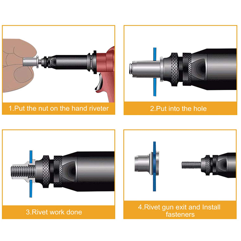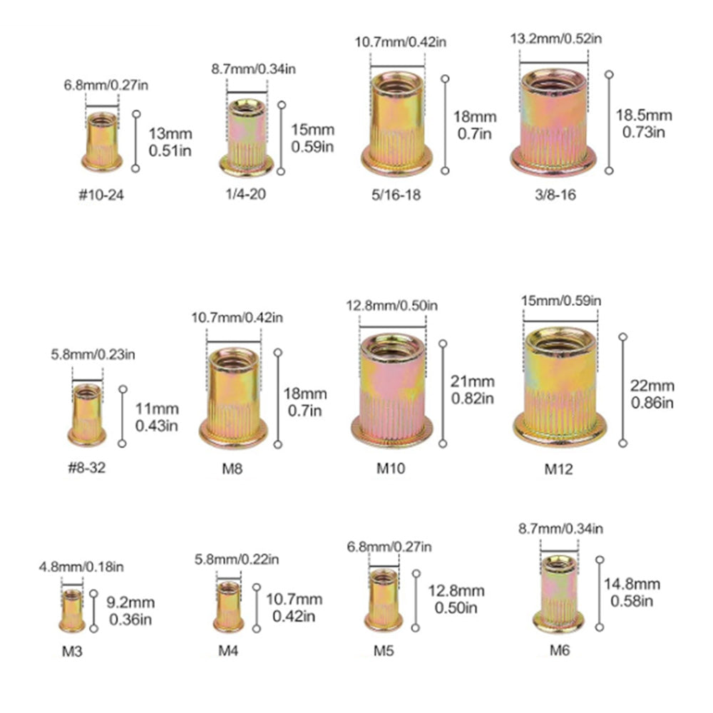 - Includes 230 rivet nuts in 12 common sizes: #8-32UNC, #10-24UNC, 1/4"-20UNC, 3/8"-16UNC, 5/16"-18UNC, M3, M4, M5, M6, M8, M10, and M12.