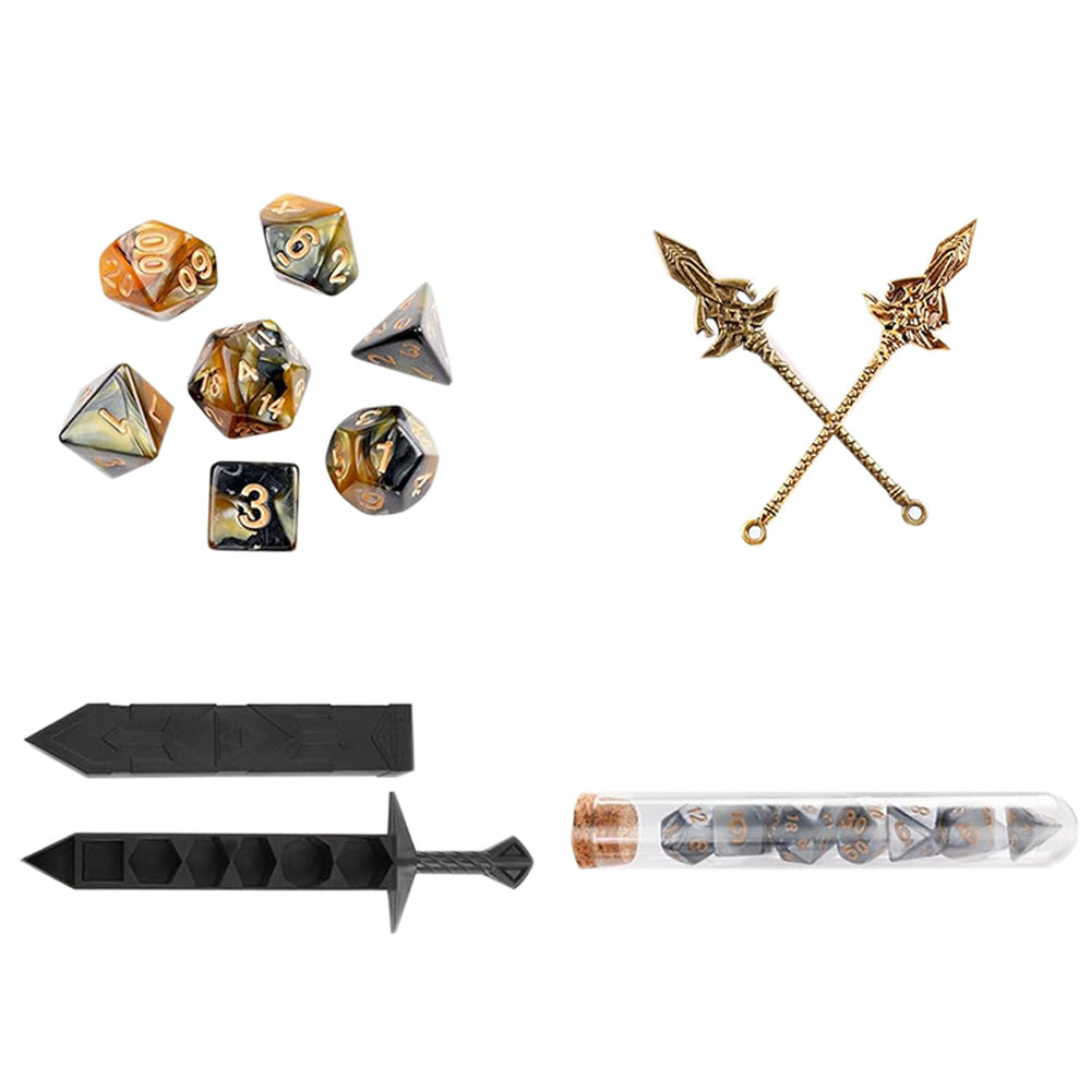 - Set includes: 24 dice + 2 toy swords + 1 glass storage bottle + 1 sword-shaped storage box, internal accessory sizes vary by style..