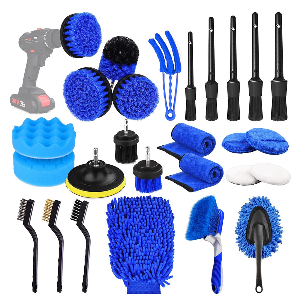 This 26pcs car detailing brush set contains car detailing brushes, drill brush, tire brush, wax applicator and washing mitt and etc., satisfy your car's internal and external beauty and cleaning.