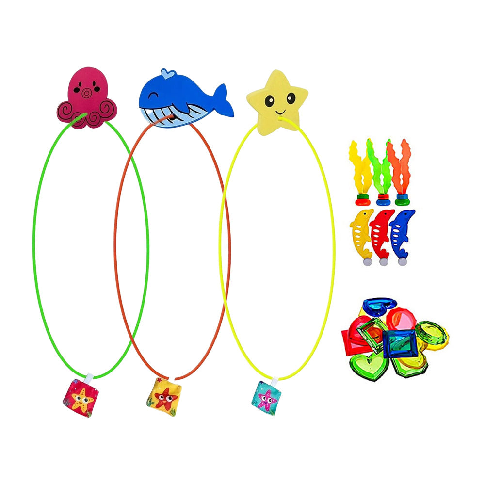 - 27pcs diving toys for kids includes: 3 diving thru rings(diameter: 80cm), 3 cartoon buoys (starfish, whales and octopus), 3 small sandbags, 3 seagrass diving toys, 3 dolphins diving toys and 12 gems toys (random color).