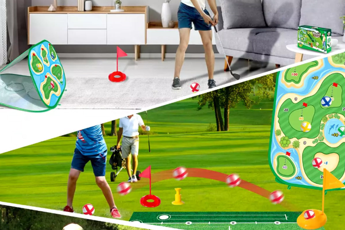 - This game set includes a 3-sided golf chipping game board, a golf putting game mat, a golf club, 6 golf sticky balls, 6 golf balls, 2 practice holes and flags, 4 golf bases and 4 ground nails, offering a complete range of golf experiences from putting to chipping.