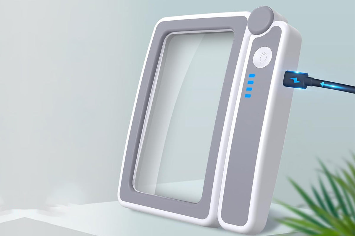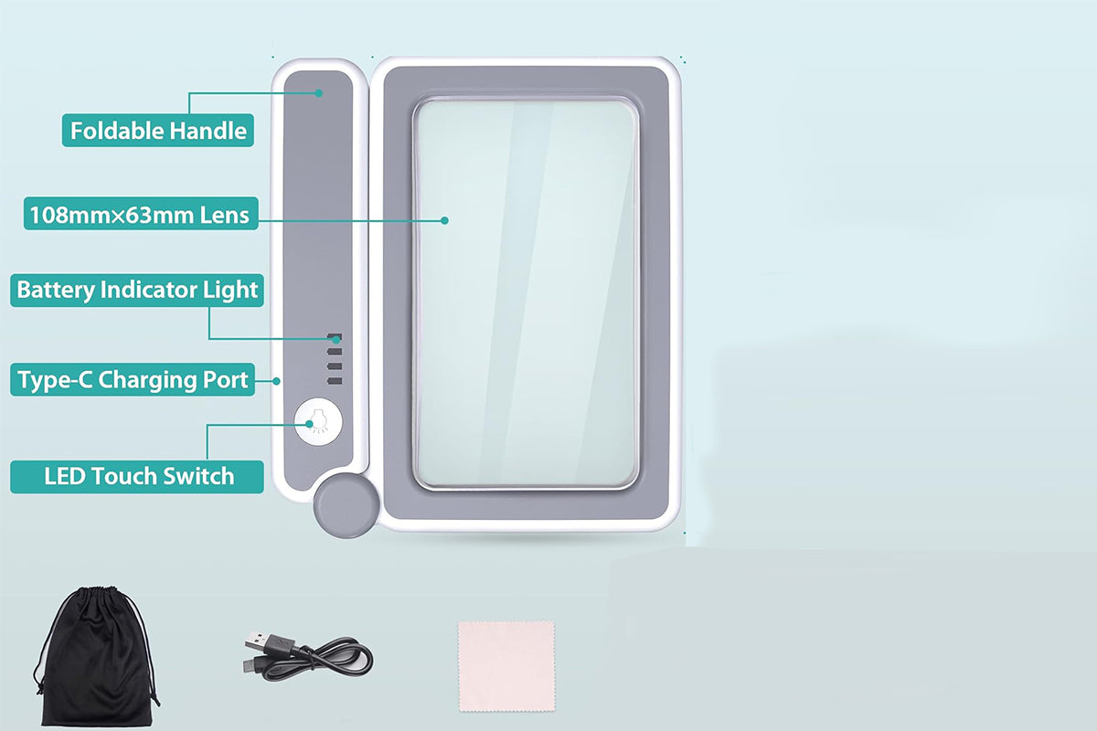 It features a clear, smooth convex glass lens, rechargeable led lights with 3 adjustable lighting modes, foldable handle for enhanced reading assistance.