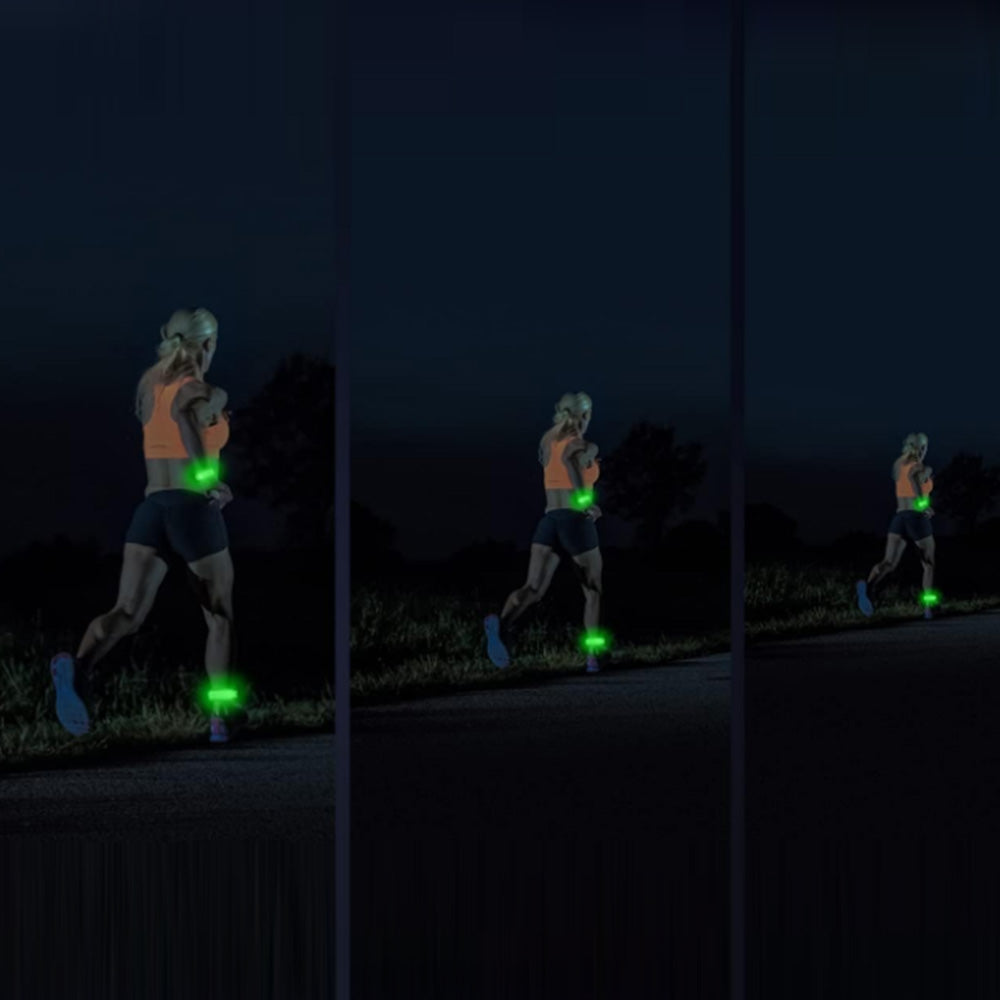 A flexible LED slap wristband with three lighting modes, designed for night running security, offering high visibility and easy wear with a lightweight, rechargeable design.
