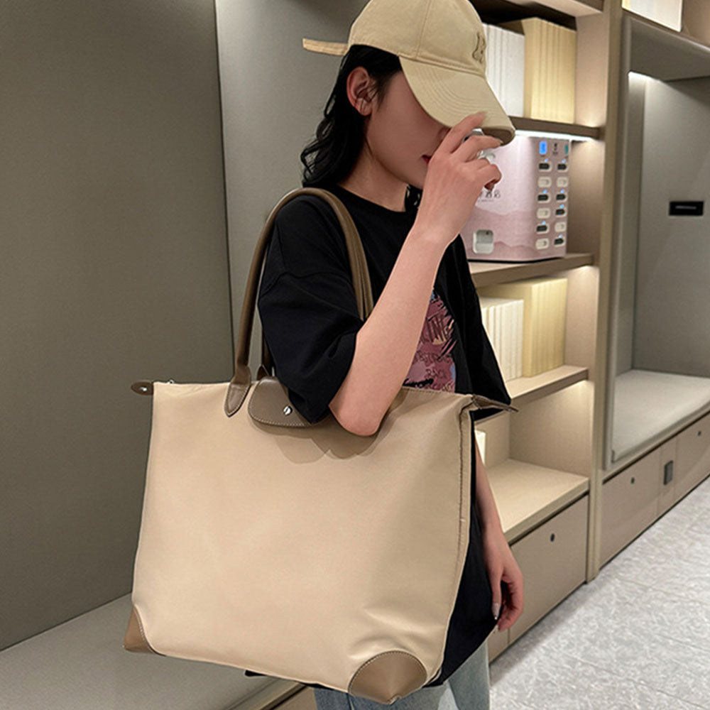 - The large tote bag is made from durable, water-resistant nylon fabric, making it easy to maintain for daily use. The interior is lined with soft polyester fabric, providing a comfortable feel.