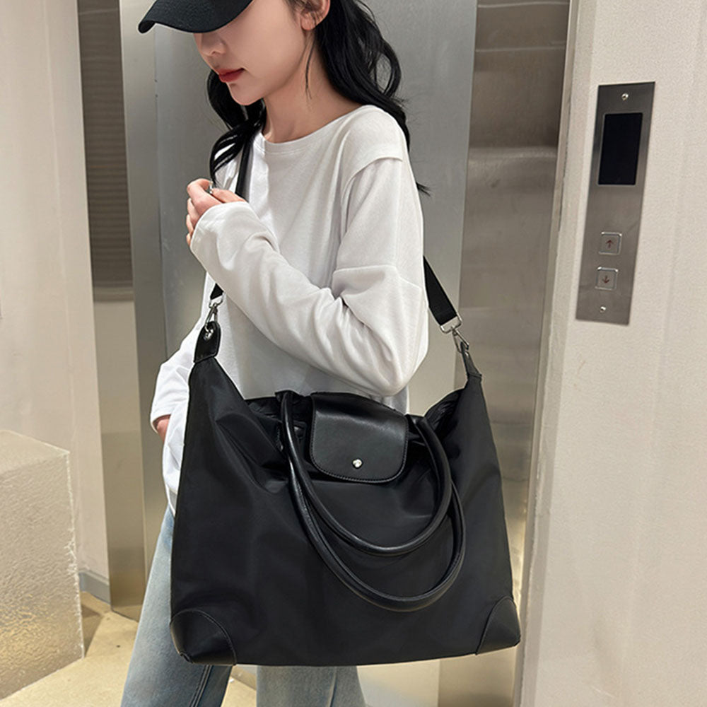 - The large tote bag is made from durable, water-resistant nylon fabric, making it easy to maintain for daily use. The interior is lined with soft polyester fabric, providing a comfortable feel.