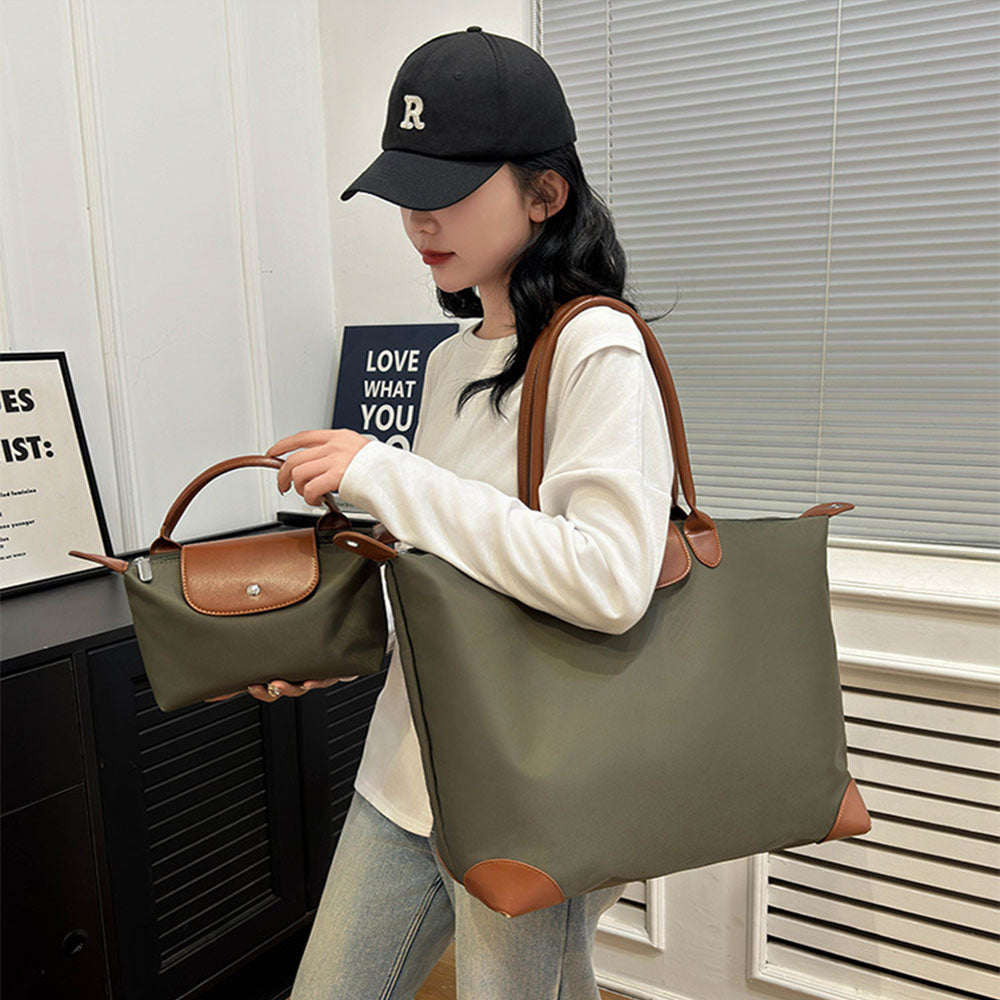 This stylish 2Pcs nylon handbag set includes a large tote and a matching smaller bag, perfect for travel, fitness, commuting, and daily use.