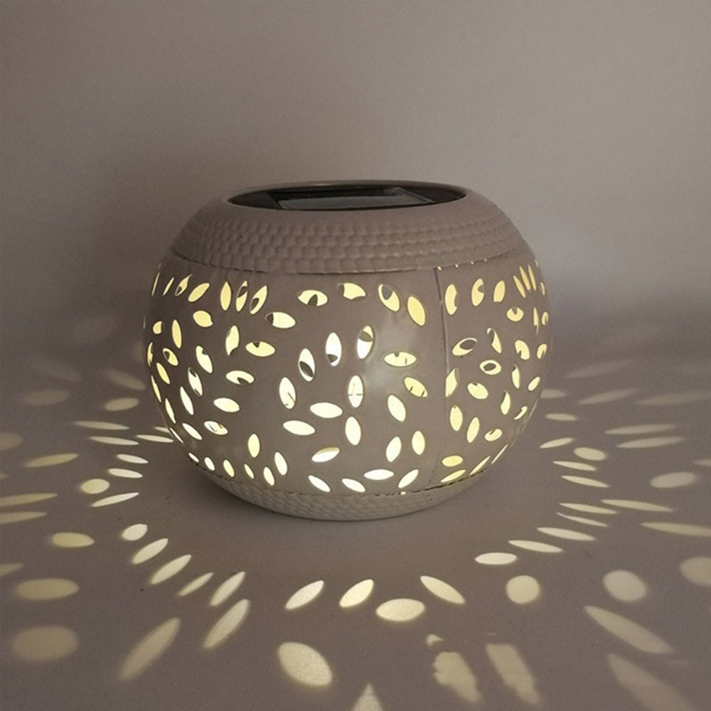 This solar lamp with a vintage metal hollowed-out surface that casts a bright, warm pattern of light in the dark, which can add an elegant and chic ambiance to gardens and porches.