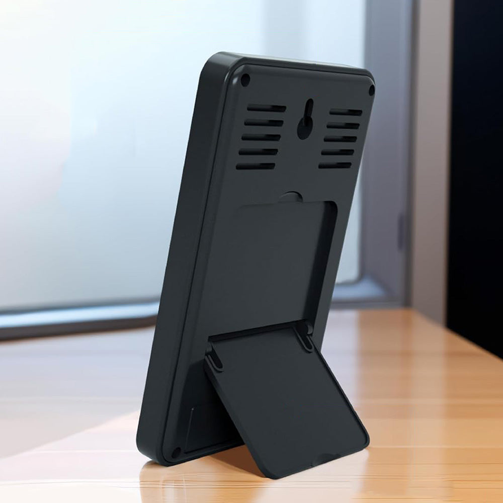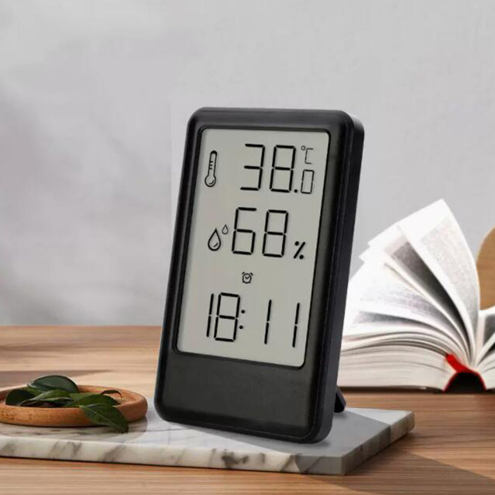- Clearly shows both temperature and humidity on a large LCD screen, with an additional digital clock function, ideal for use as a bedroom alarm clock or office monitor.