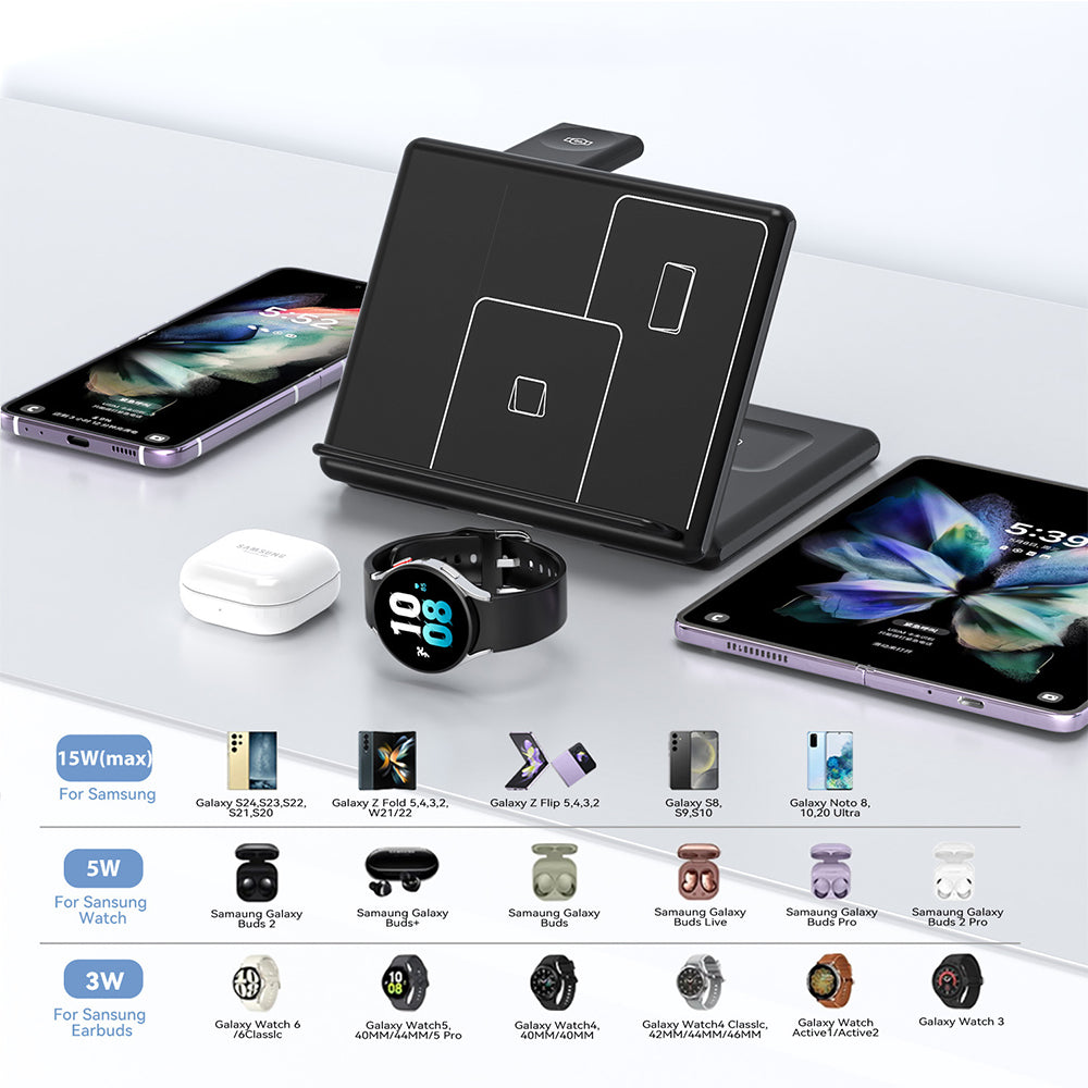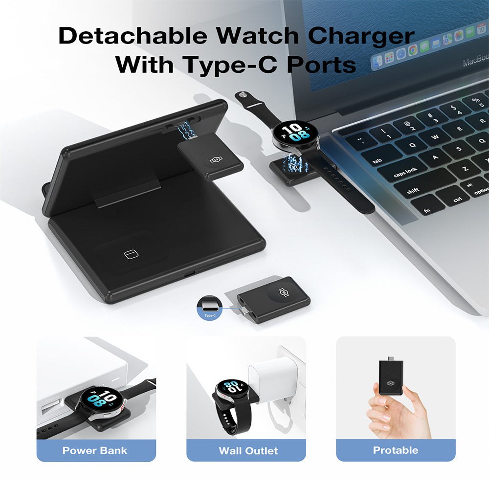 Foldable 3-in-1 wireless charger with detachable watch dock, designed for Samsung phones, earbuds, and watches, offering fast and convenient charging.