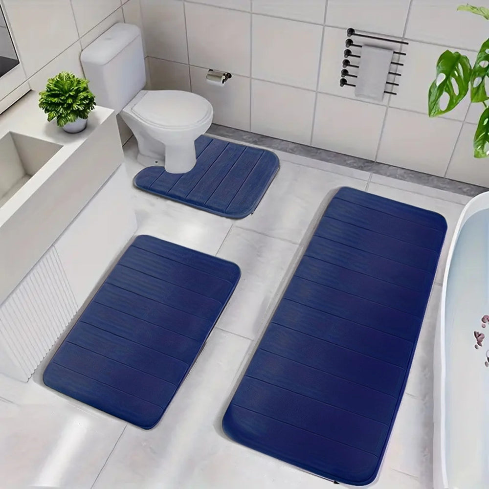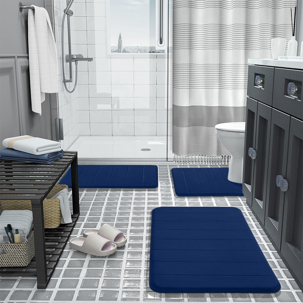 3 Pieces Set Water Absorption Bathroom Floor Mats Non-Slip Bath Mats Deep Blue