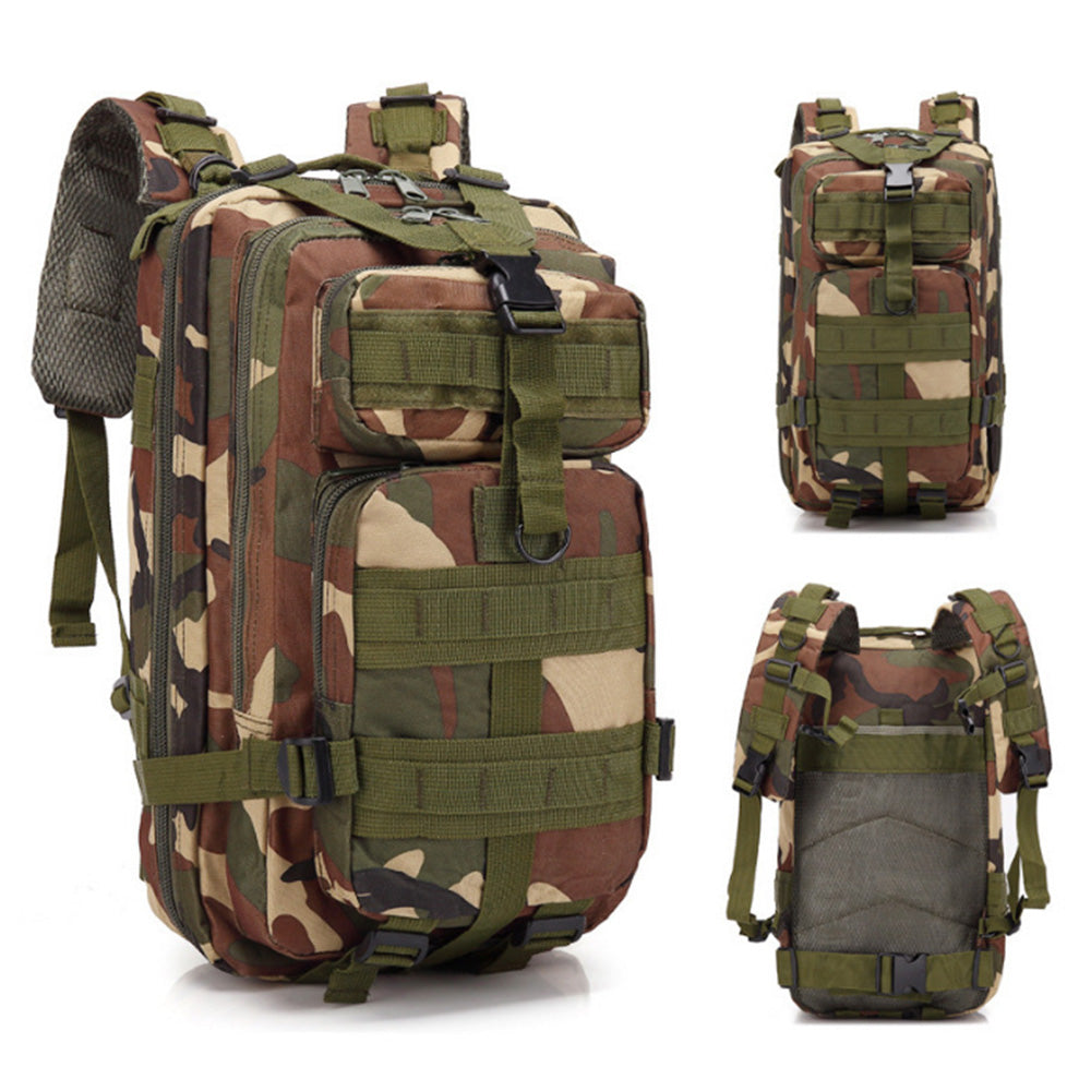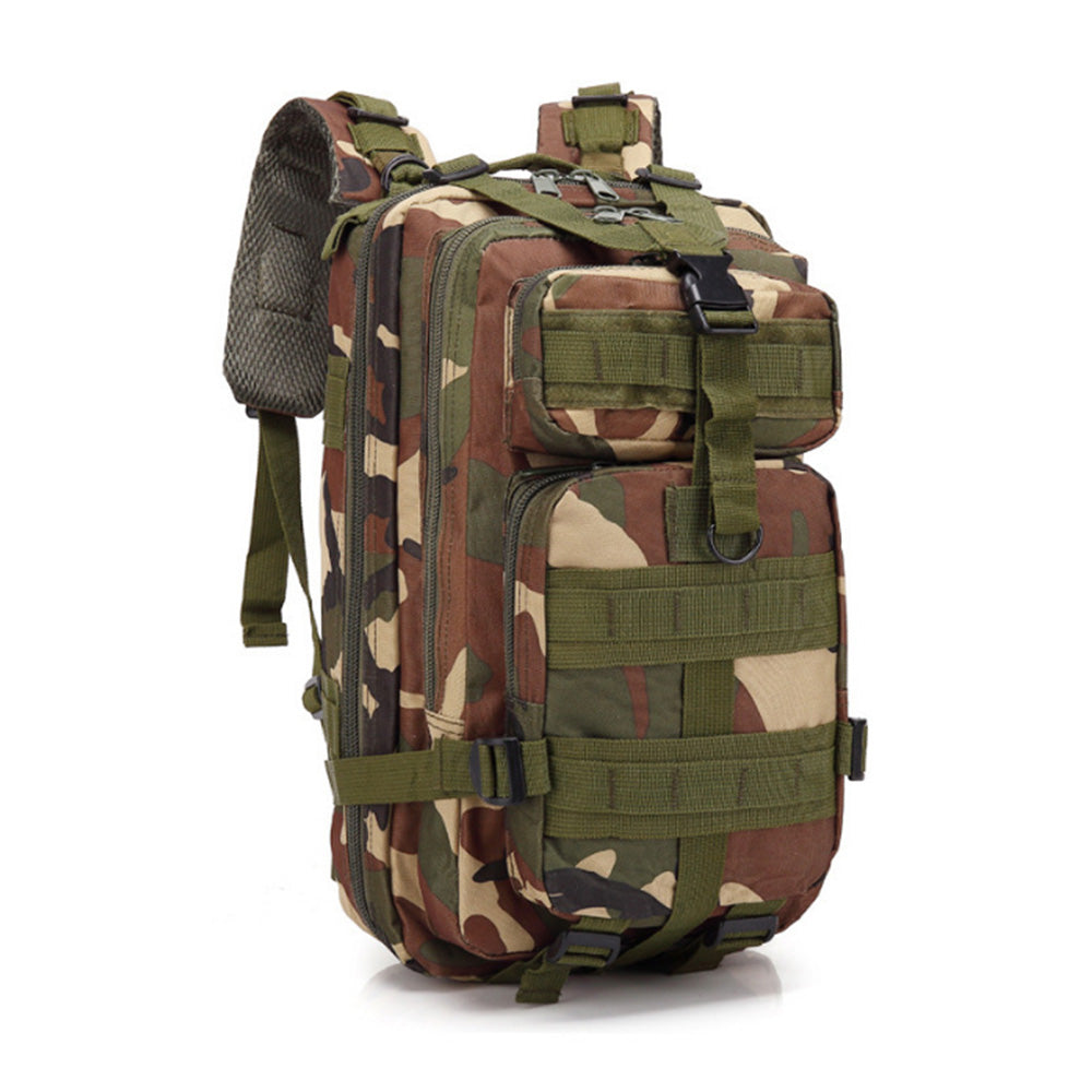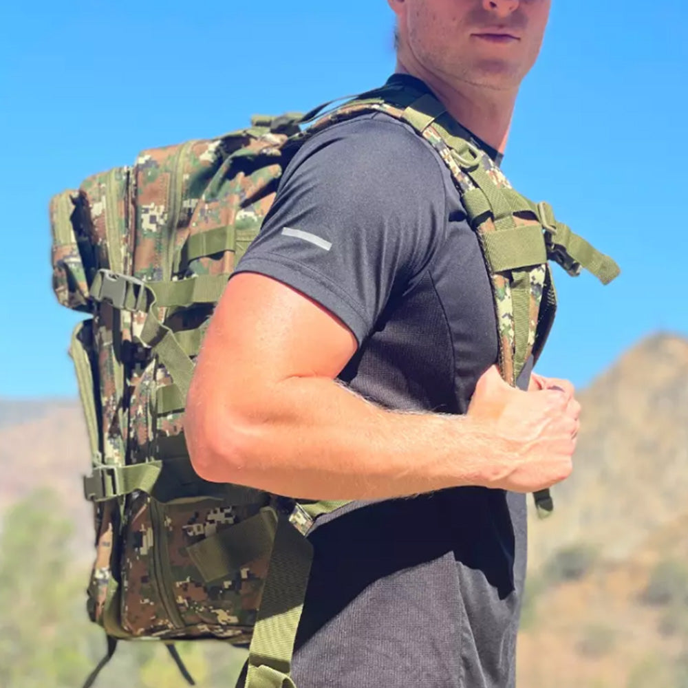 A 30L military-style tactical backpack, designed for hiking and camping, offering ample storage, durable materials, and multiple adjustable features for comfort and convenience.