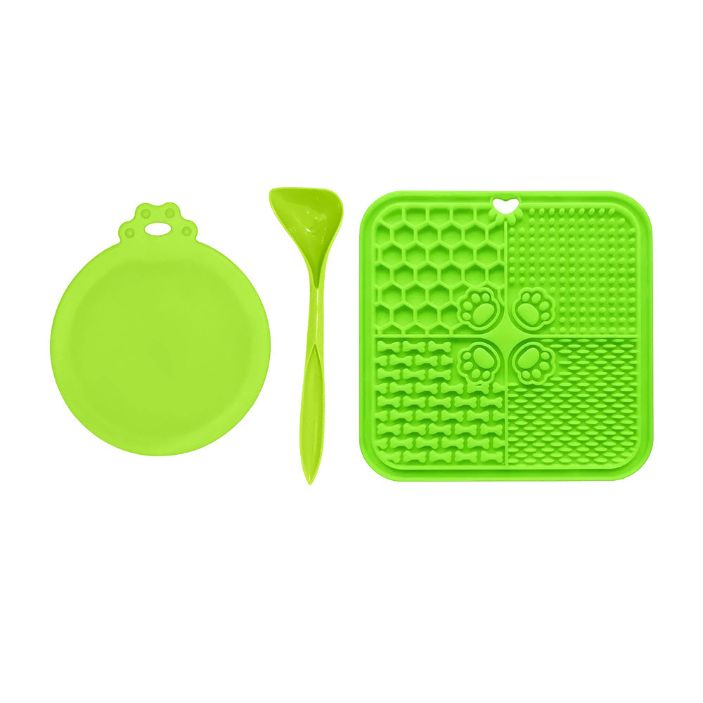 3Pcs Dog Feeding Set Silicone Pet Slow Feeder Lick Mat with Can Lids and Spoon Green