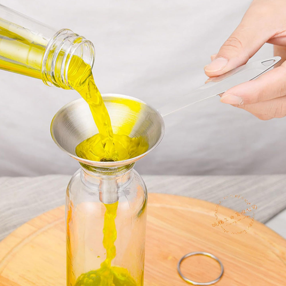 - The small stainless funnels take up less space and can be hooked together with a ring, keep your kitchen clean and neat.