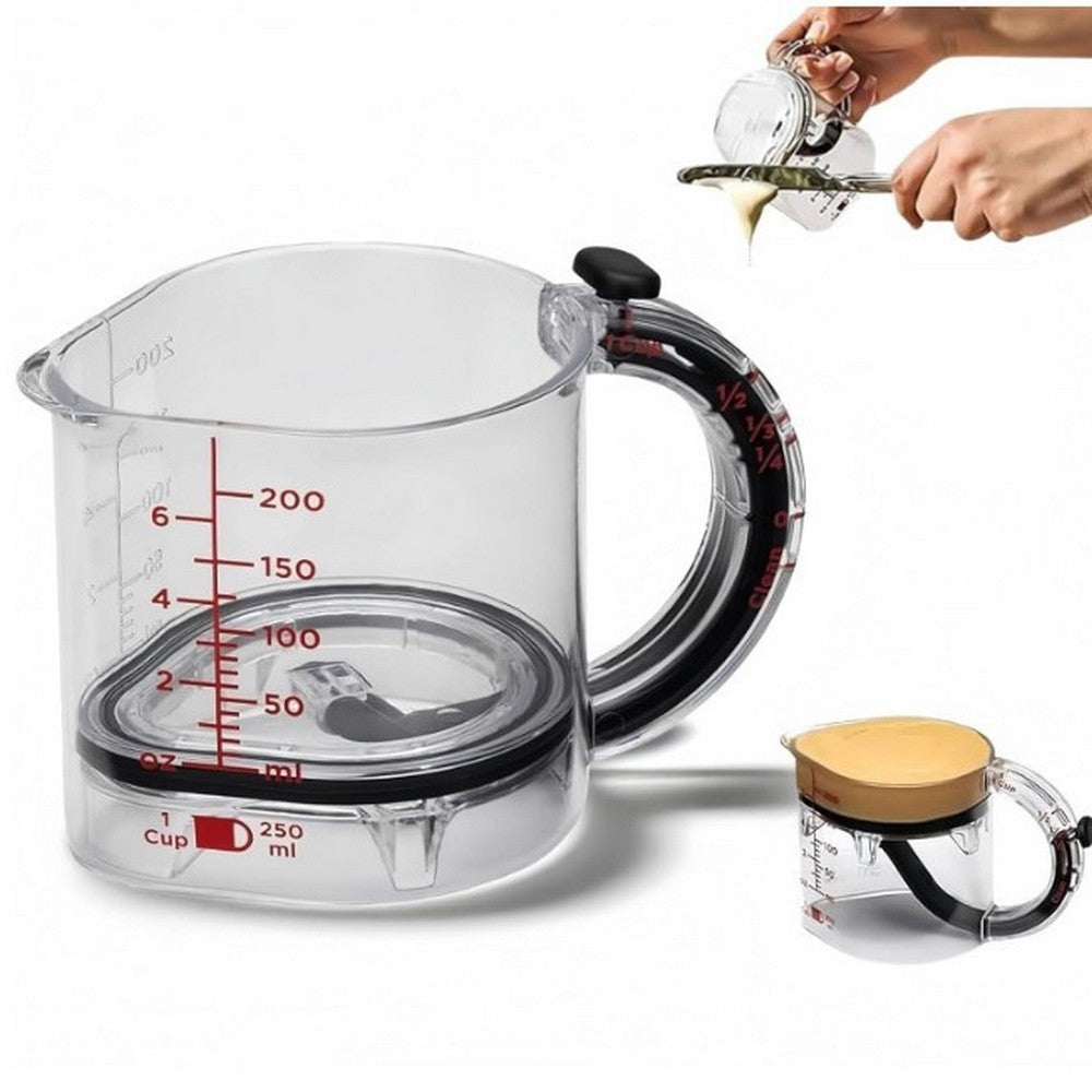 - A smart 4-in-1 adjustable measuring cup that combines measuring, pouring, scraping, and stirring functions in one compact tool, featuring dual-scale markings (mL and fl oz) and a push-release base for mess-free, precise kitchen prep.