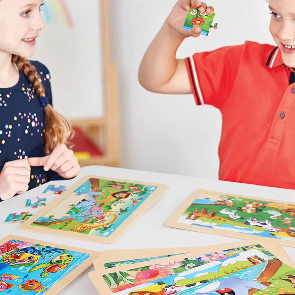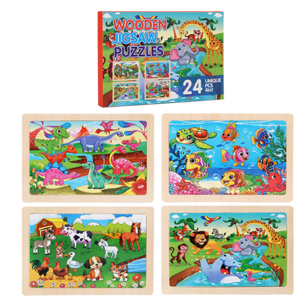 A set of 4 wooden puzzles with 24 pieces each, designed for preschoolers to enhance cognitive and problem-solving skills through fun and educational jigsaw play.