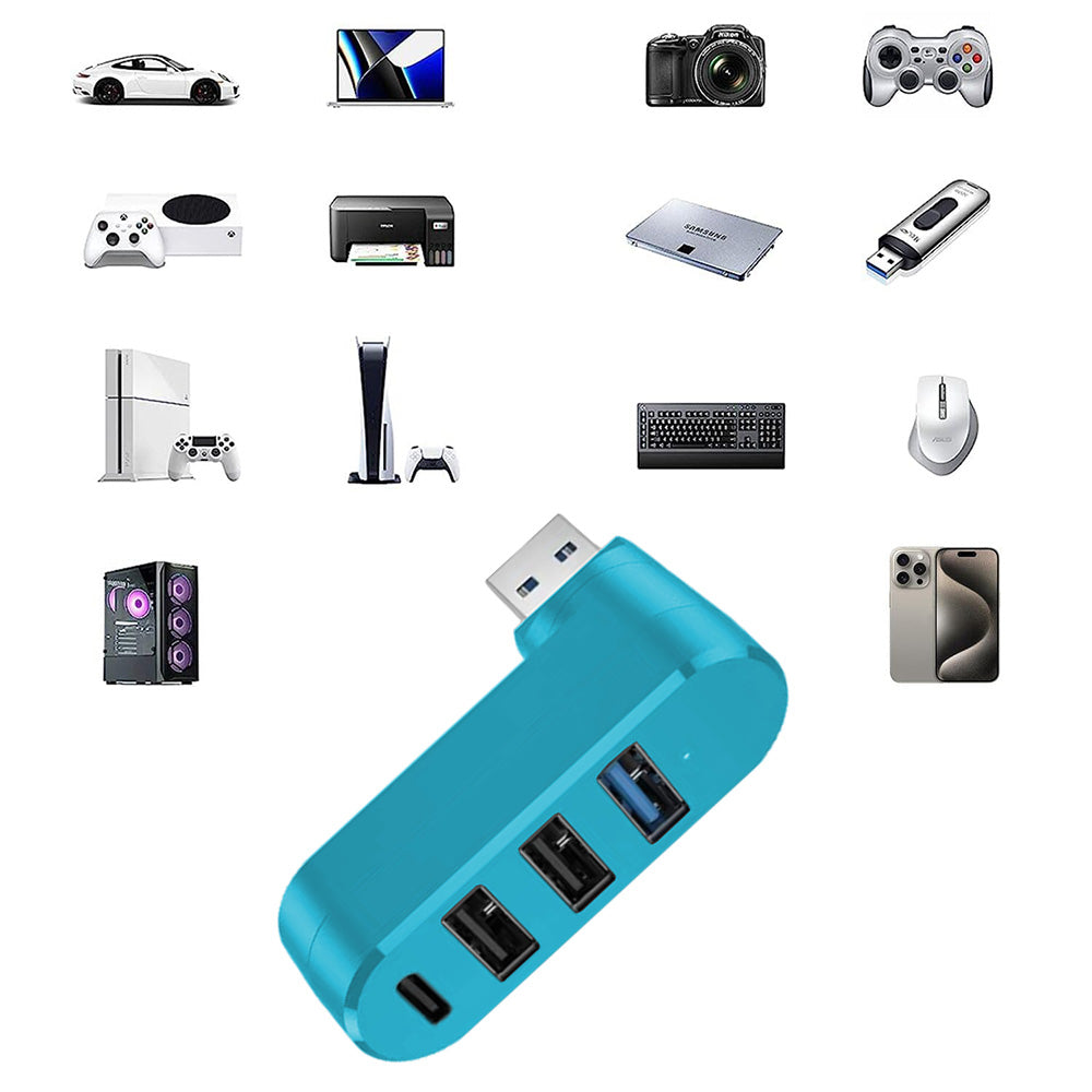 4-Port USB 3.0 Hub 180-Degree Rotating USB Splitter for Laptop Car Blue