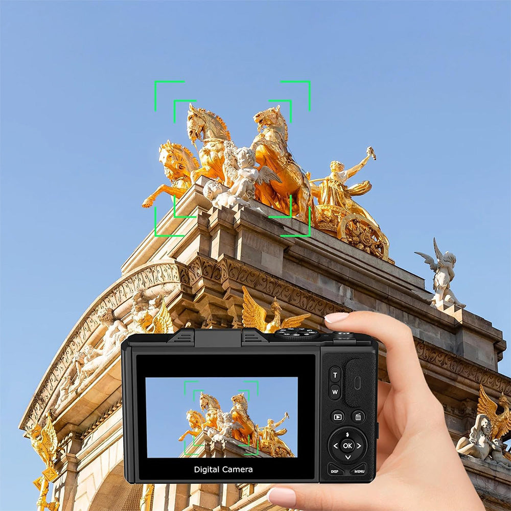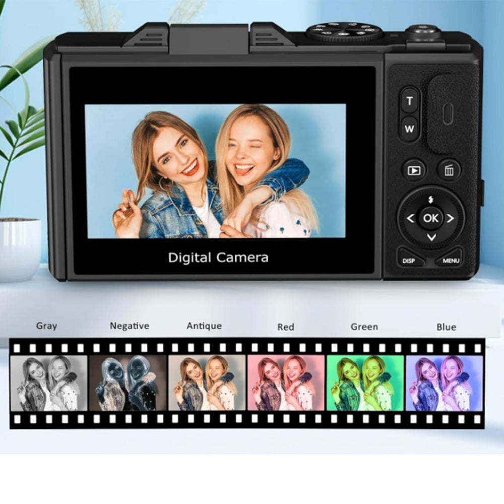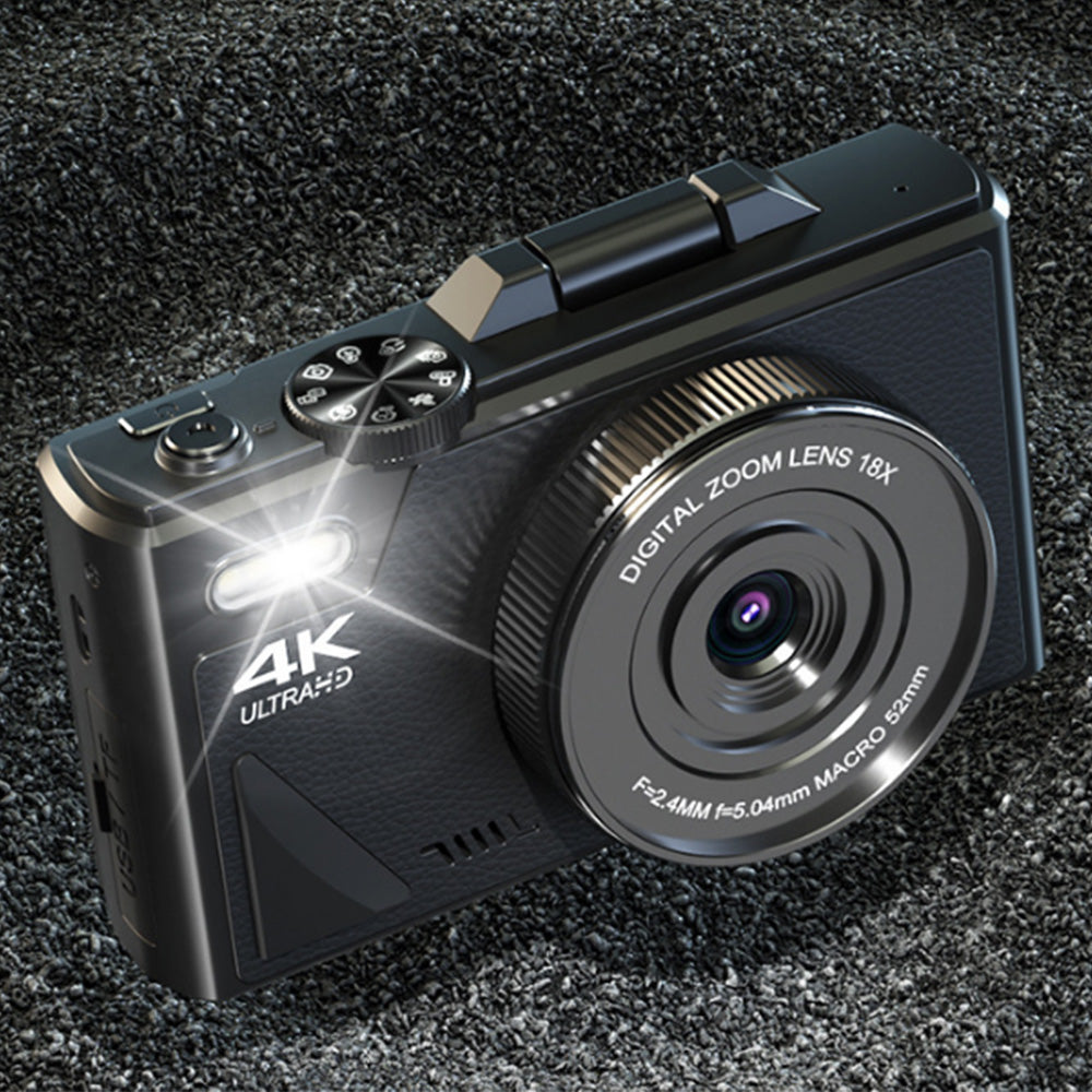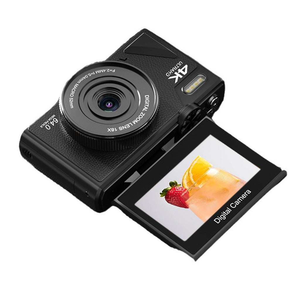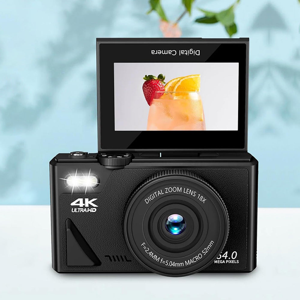 A versatile 4K digital camera featuring a 180-degree flip screen, perfect for capturing high-quality photos and videos from any angle.
