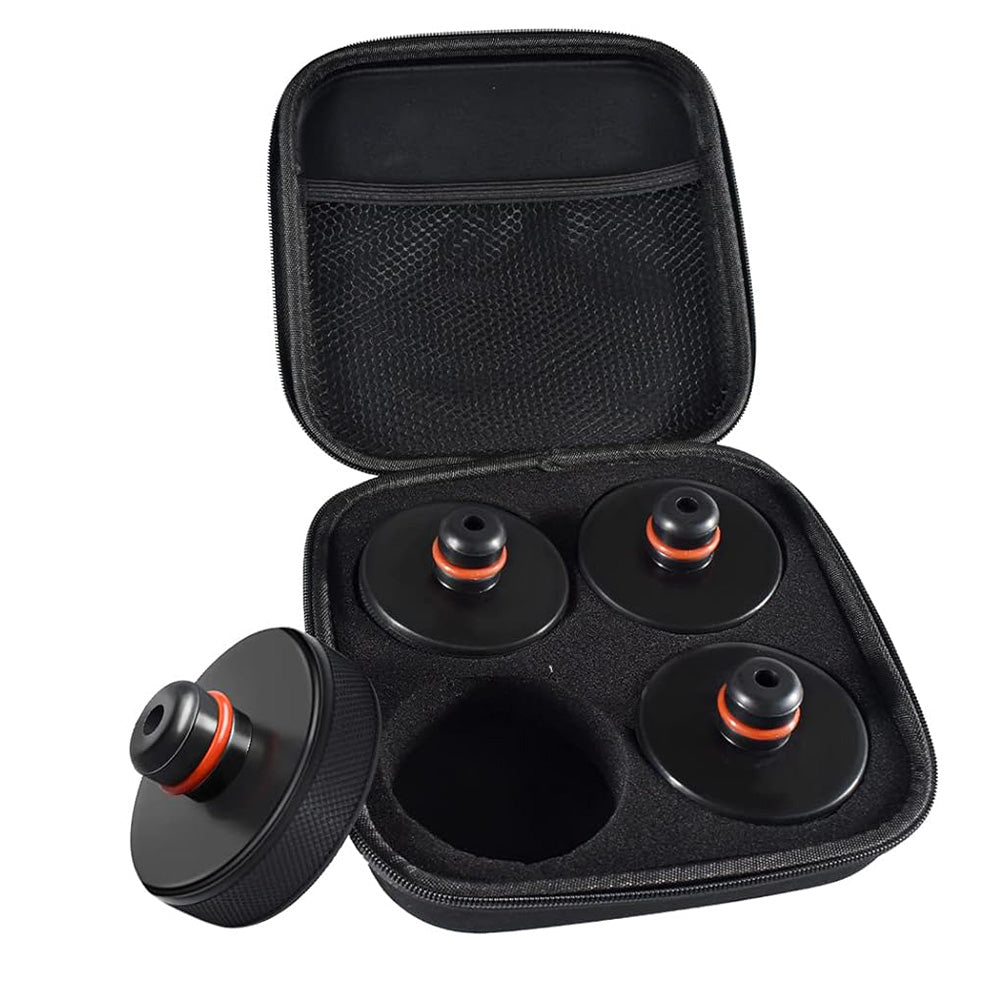 Vehicle-specific TPE rubber jack pads designed to protect Tesla battery frames during lifting, complete with organized storage solution.