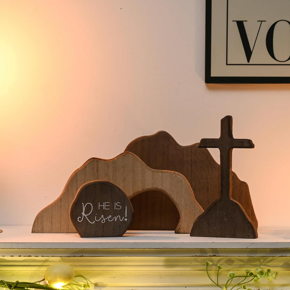 - The Easter decorations include 3pcs wood tomb set wording "HE IS Risen!", 1pc wood cross, it's full of Christian resurrection meaning and atmosphere.
