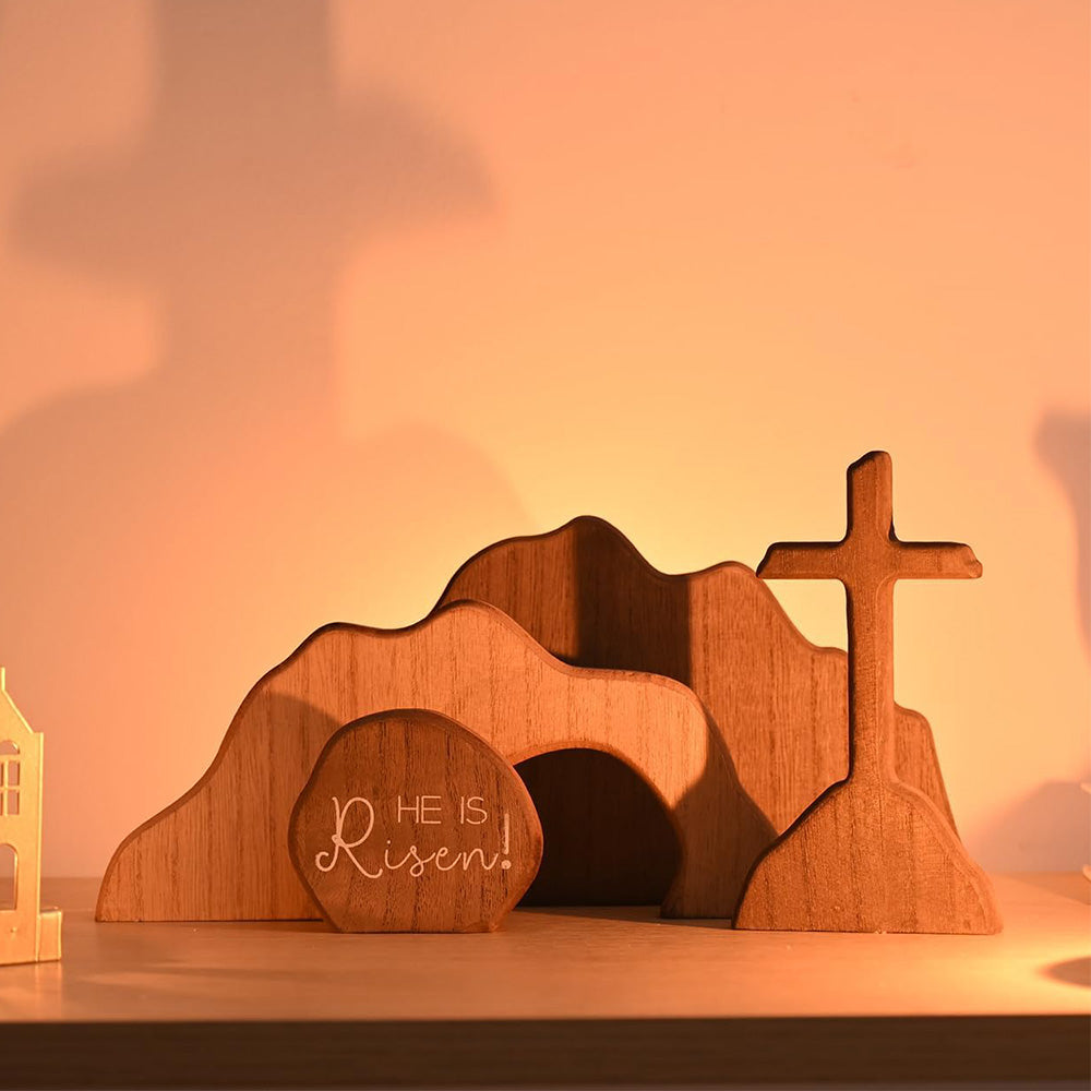 4Pcs Set Wooden Empty Tomb Easter Scene and Cross Decoration Home Office Tabletop Shelf Decor