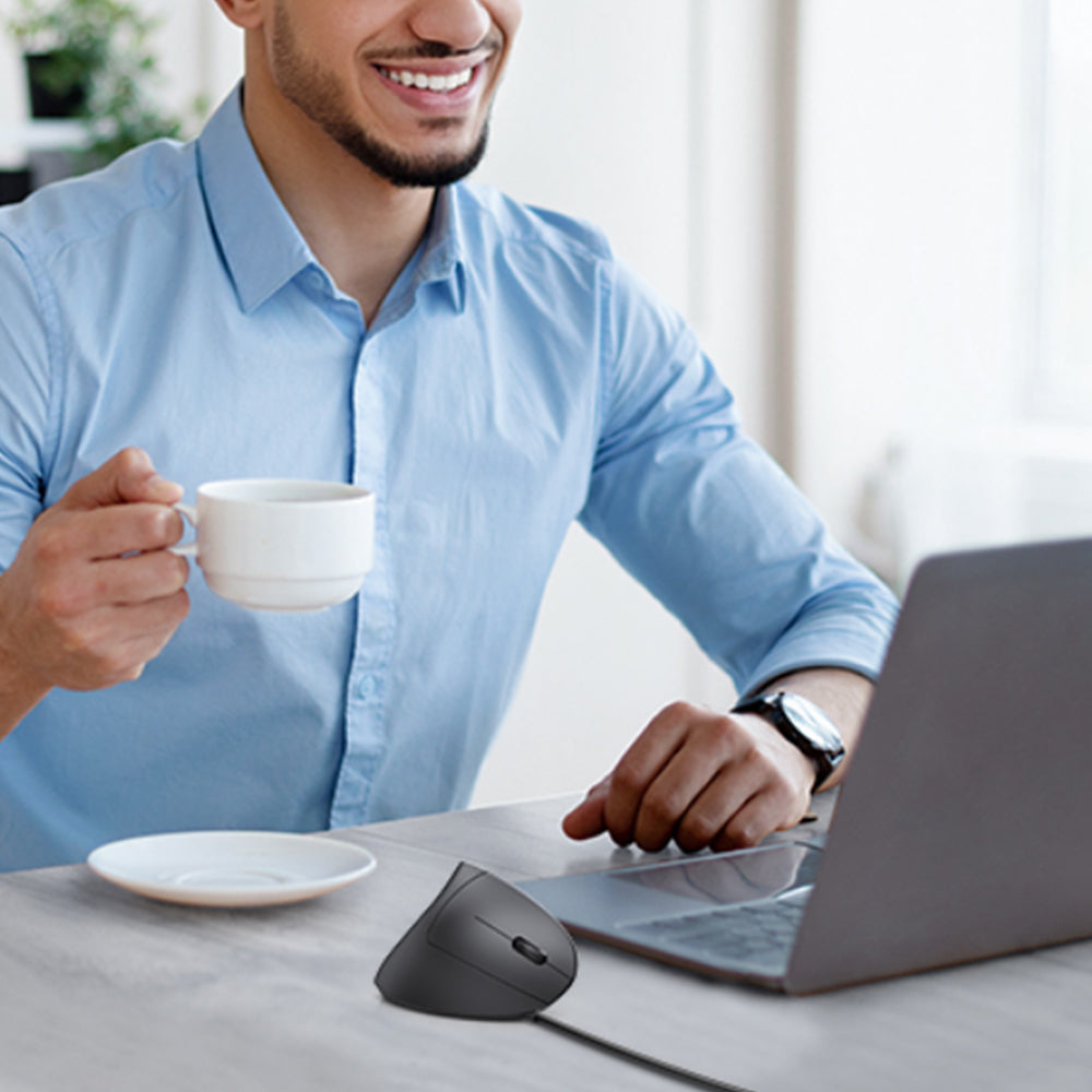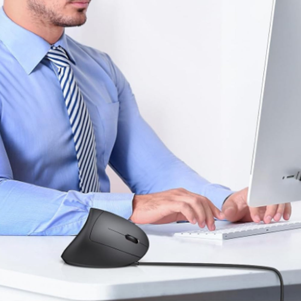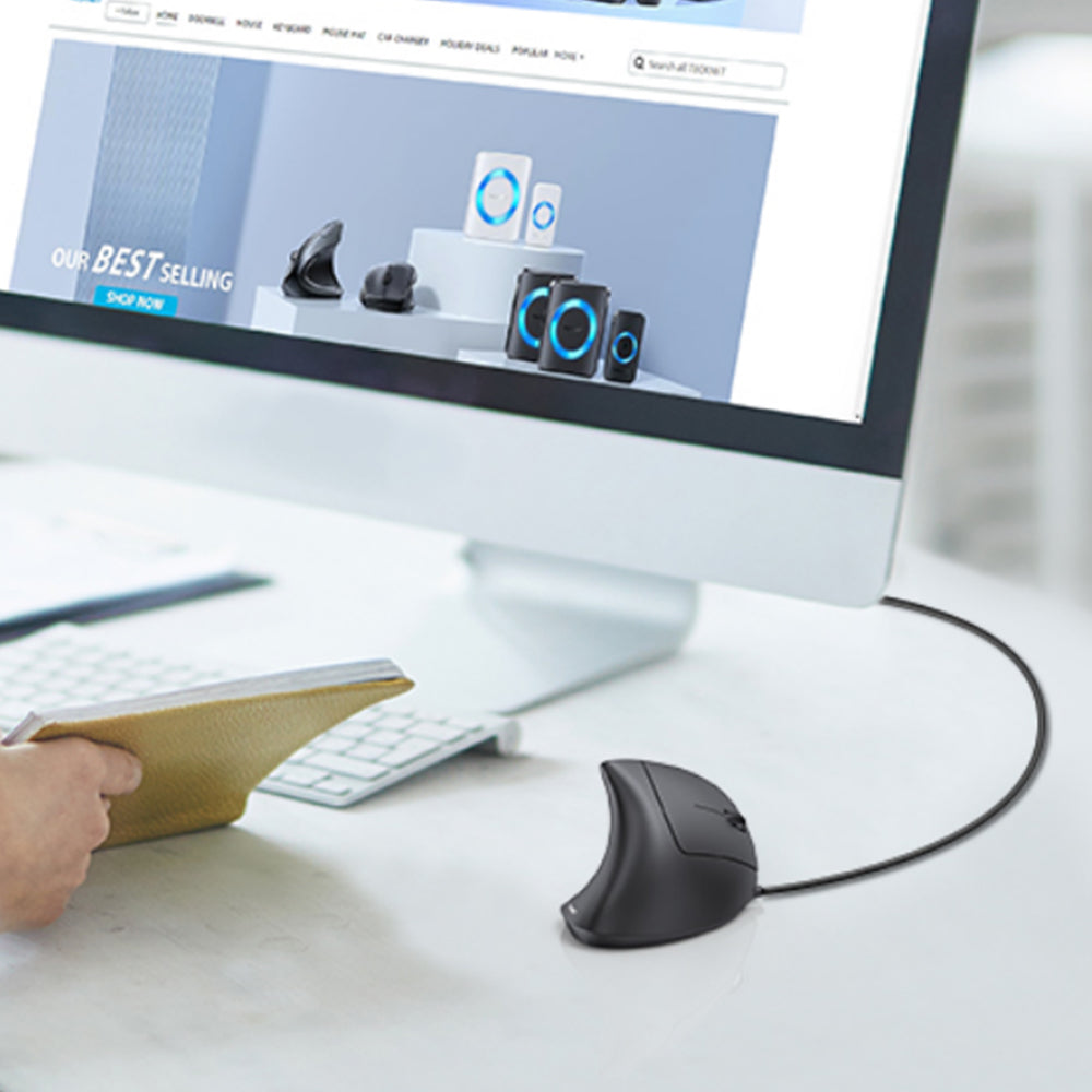 The wired mouse with ergonomic vertical design, anti-slip scroll wheel, three adjustable DPI levels, and side shortcut buttons for efficient browsing and office work.