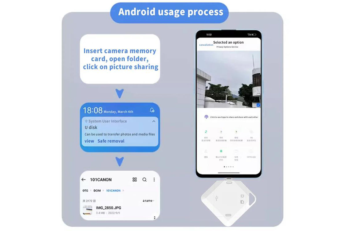 - Equipped with dual card slots for SD and TF cards, this card reader also functions as a selfie stick. Simply press and hold to power on, connect via Bluetooth to your phone, and use the switch button to control photo taking remotely.