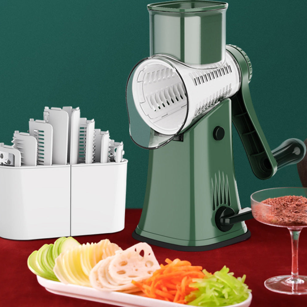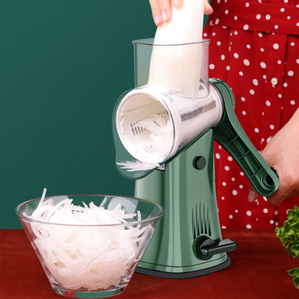 Manual rotary grater and chopper, perfect for slicing, shredding, and cutting vegetables and fruits, making meal prep quick and effortless.
