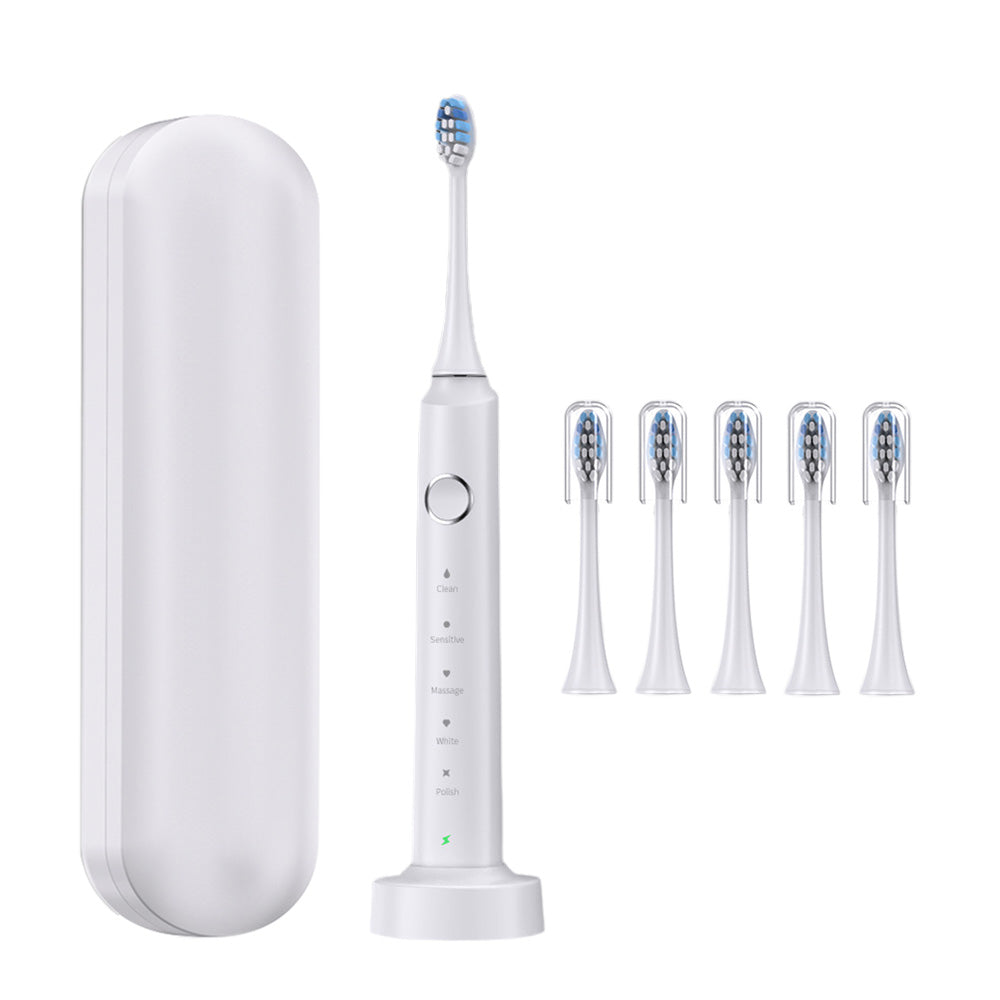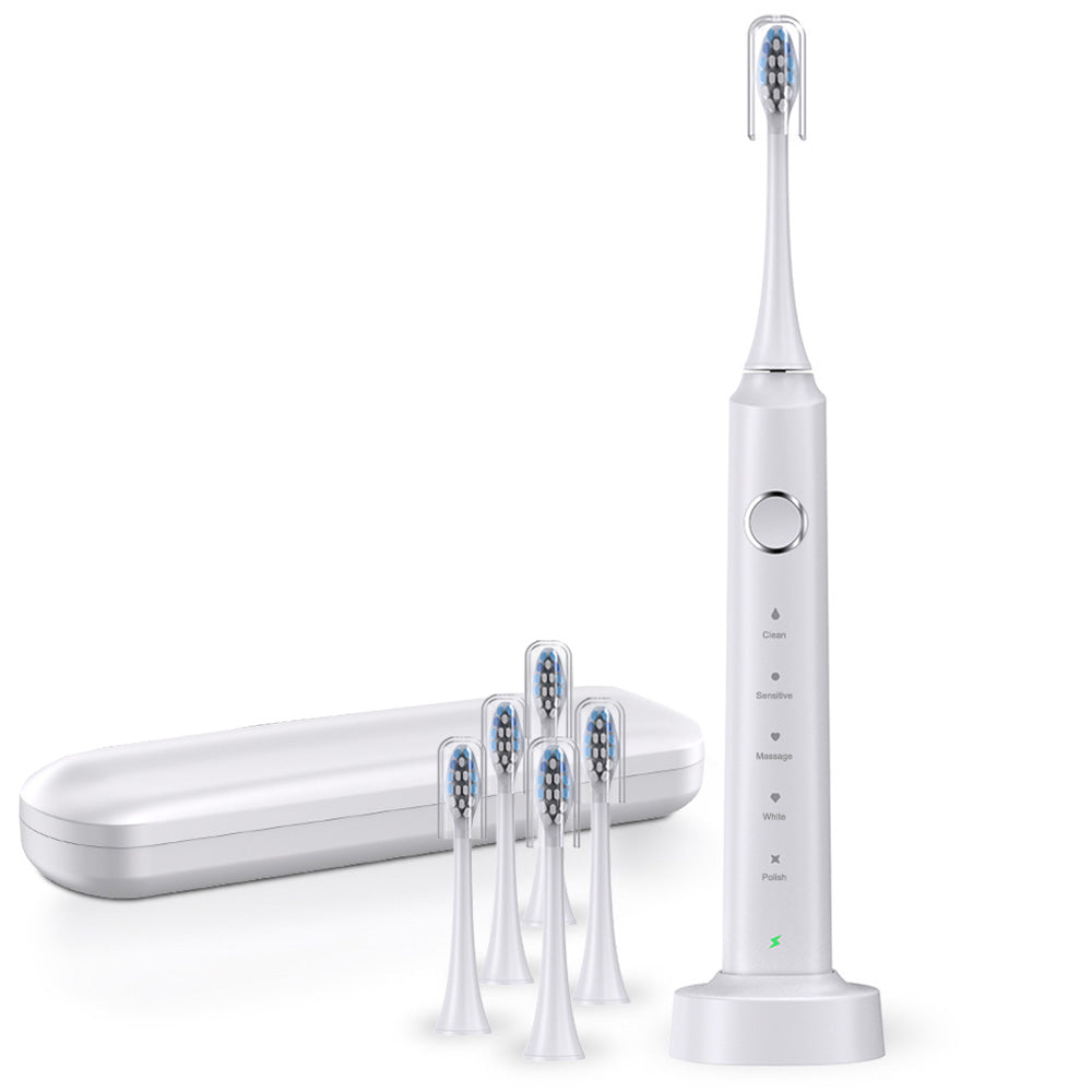5-Mode Electric Toothbrush with Timer Travel Sonic Toothbrush with 6 Replacement Heads White