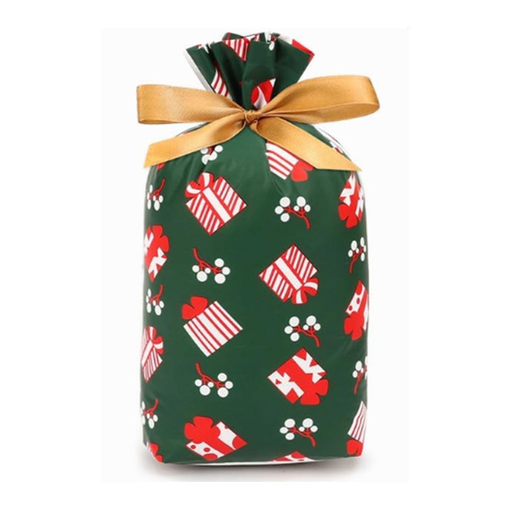 The Christmas candy treat bag features festive designs and a sturdy drawstring closure, perfect for holding sweets and small gifts during holiday celebrations.