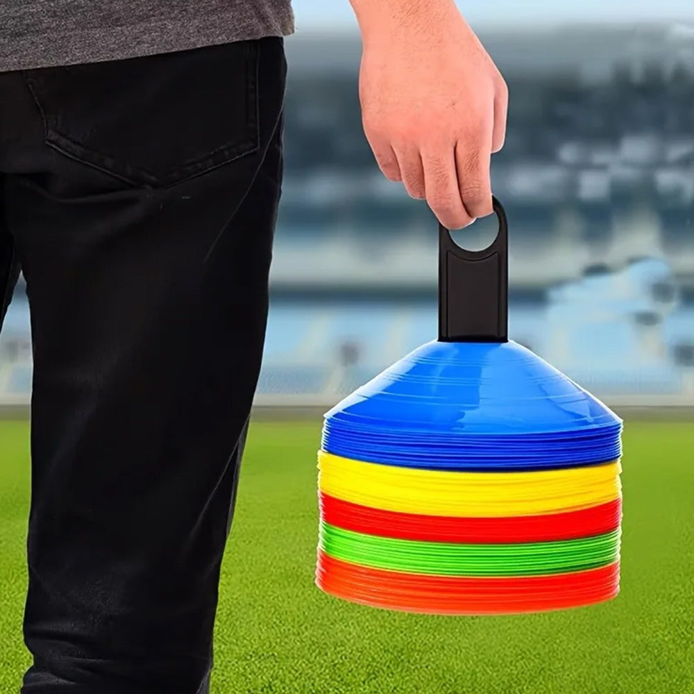 - This soccer cones set consists of 50x sports cones (10 red, 10 orange, 10 yellow, 10 green, 10 blue), 1x net shaped tote bag and 1x plastic stand.
