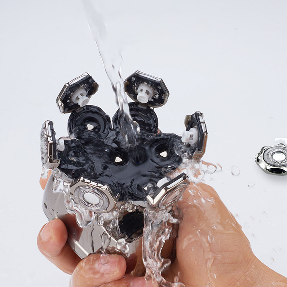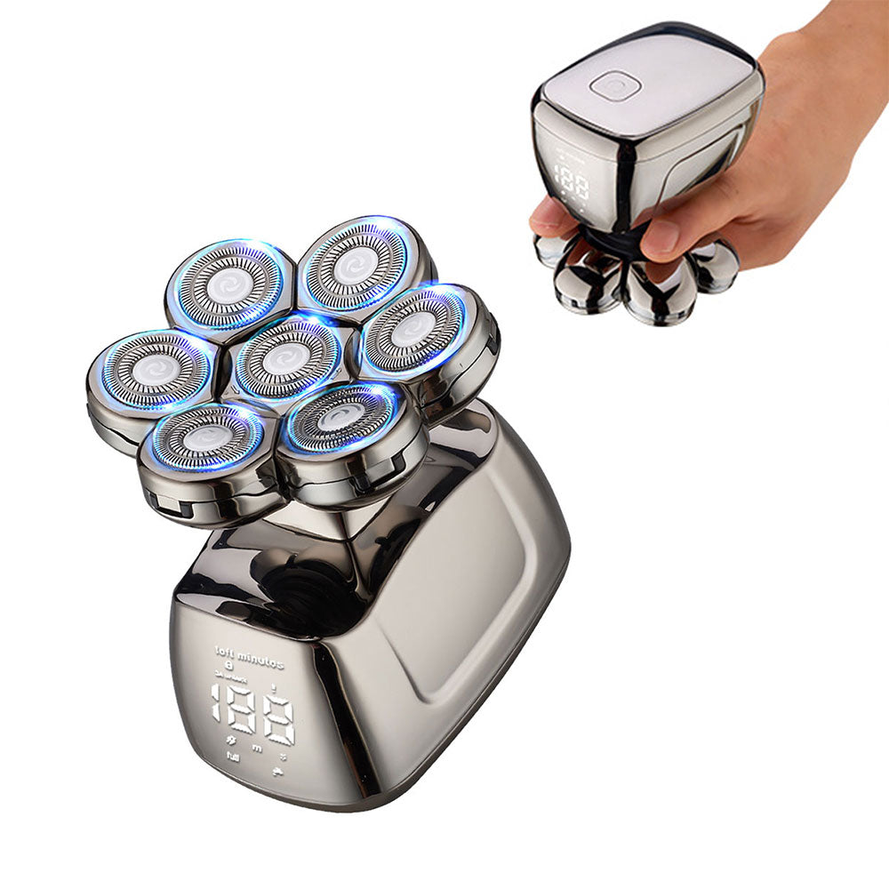 A versatile 6-in-1 head shaver designed for bald men, featuring multiple interchangeable heads for shaving, trimming, and grooming with precision.