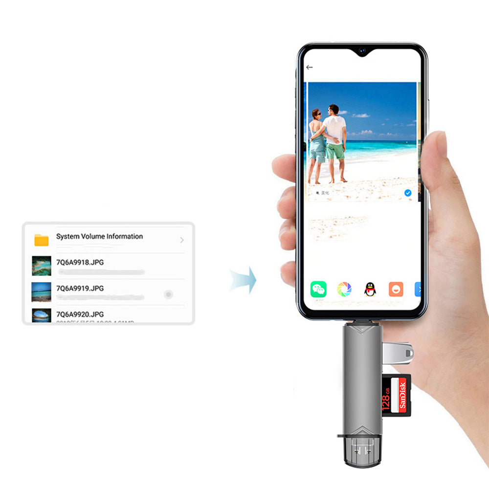 The 6-in-1 card reader is designed to quickly read data from memory cards and transfer files to OTG-enabled devices such as computers, MacBooks, phones, and Chromebooks.