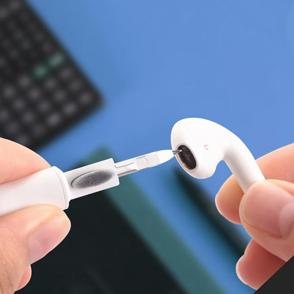 Complete cleaning solution for wireless earbuds featuring 6 specialized tools to remove earwax, dust and debris from delicate components.